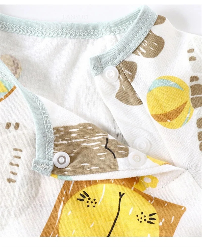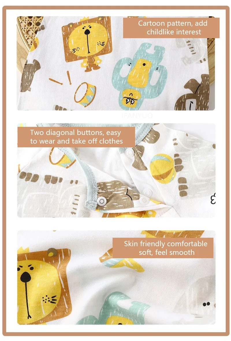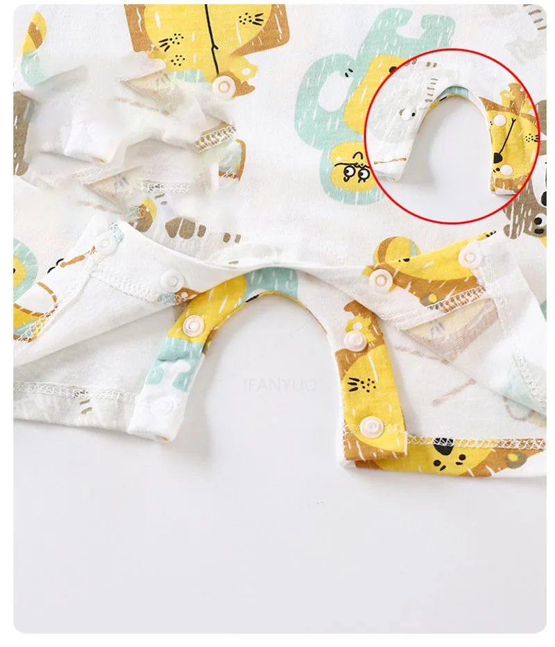 2.O macacão tem um estilo de manga curta, adequado para uso no verão.Ele também possui um design de corte aberto, tornando conveniente para os bebês trocar fraldas, reduzindo o número de trocas de fraldas e facilitando o cuidado dos pais.