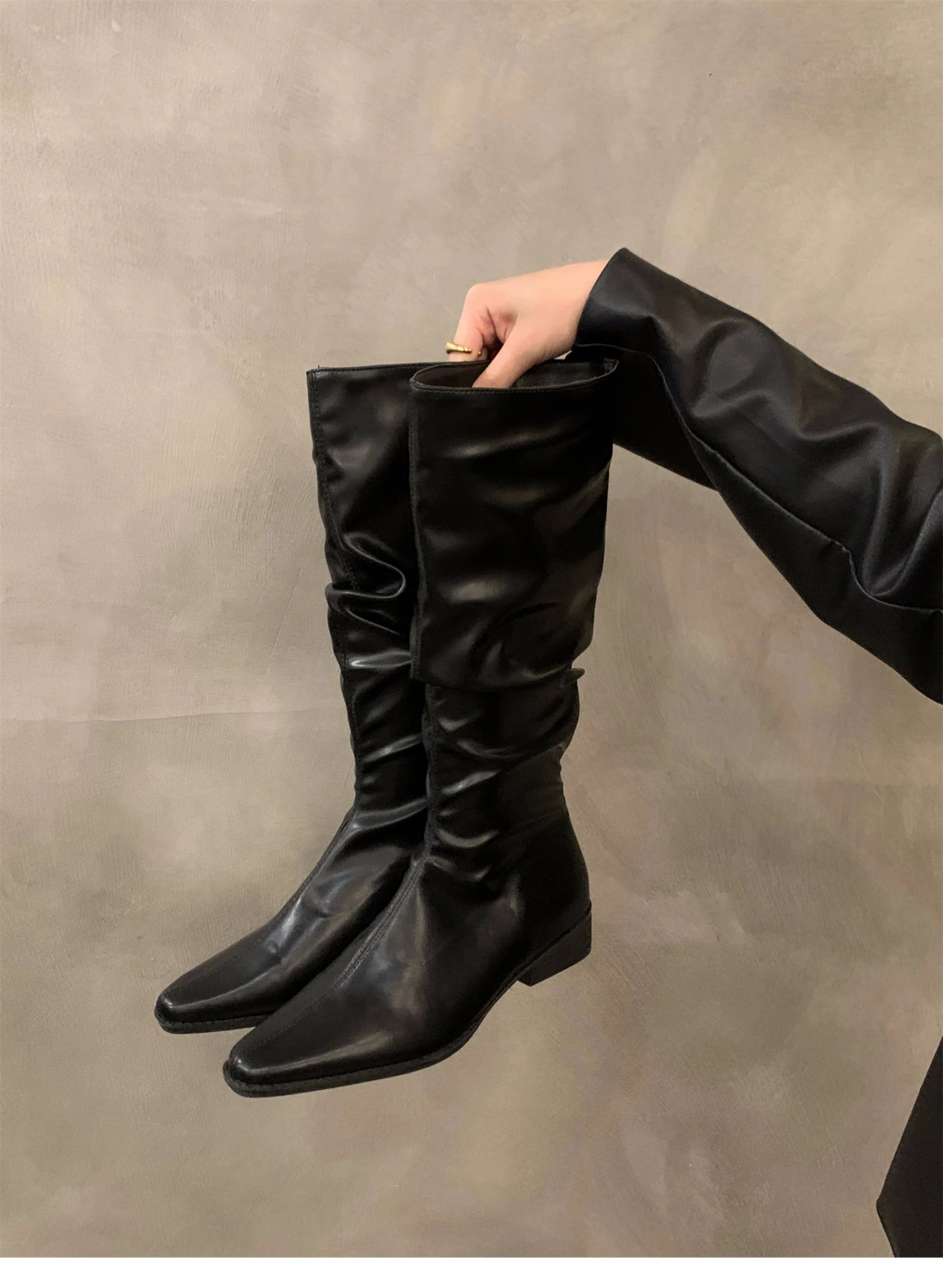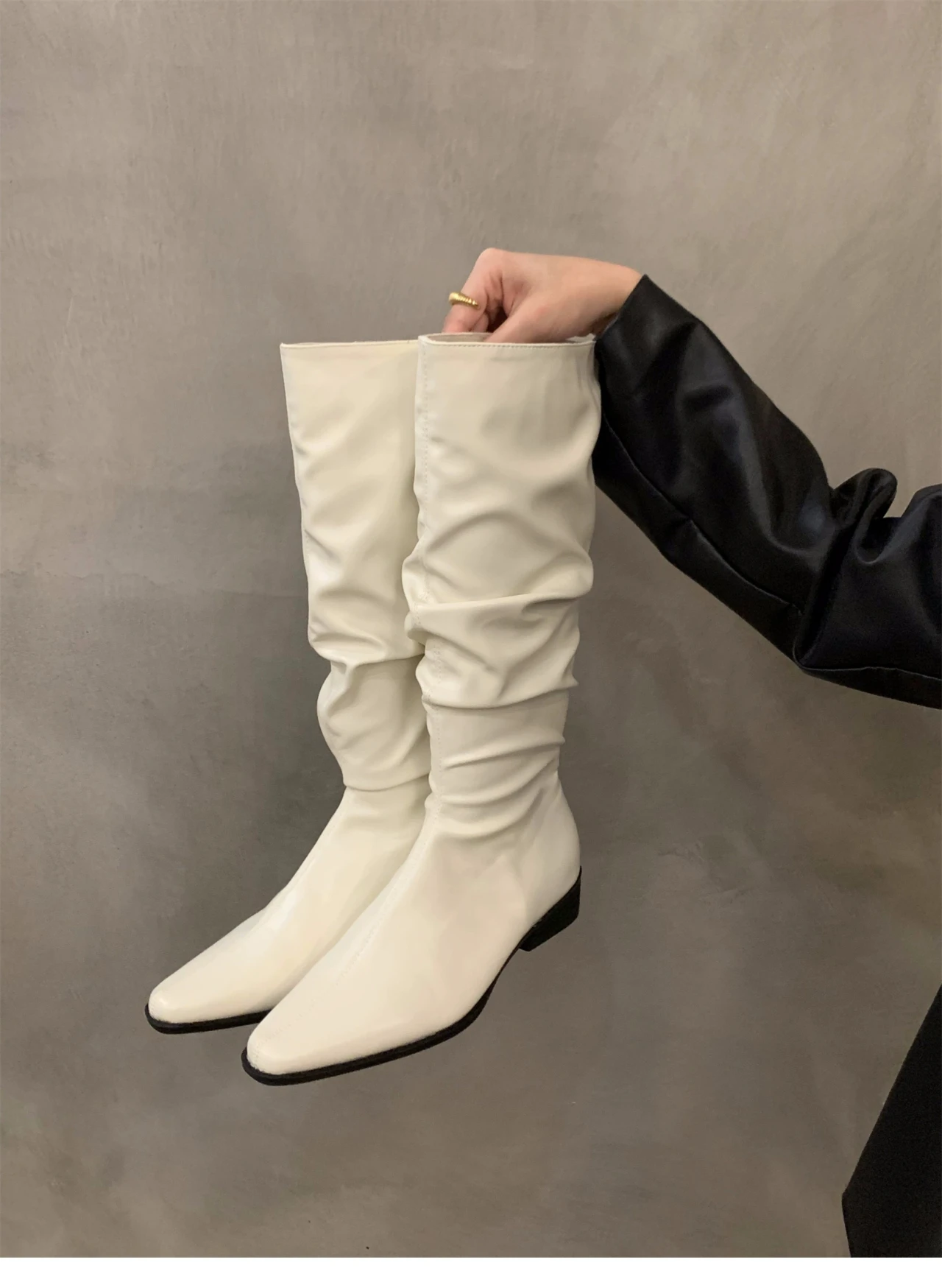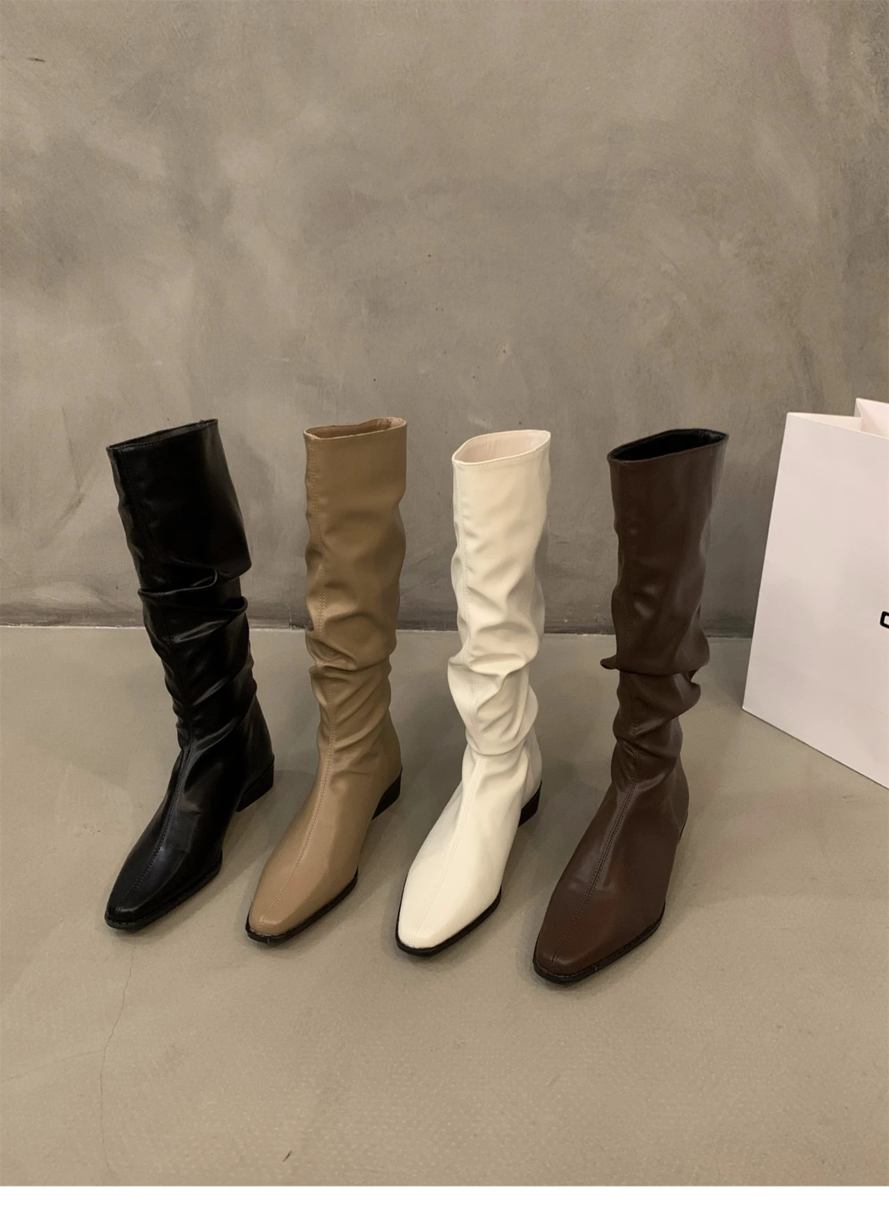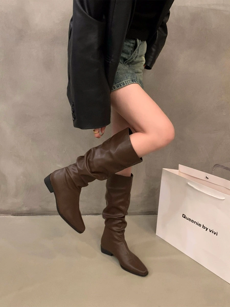 - > Botas altas para o joelho feminino, sapatos femininos, dobras deslizantes, salto baixo, dedo do pé redondo, plano, longo, moda, outono, inverno