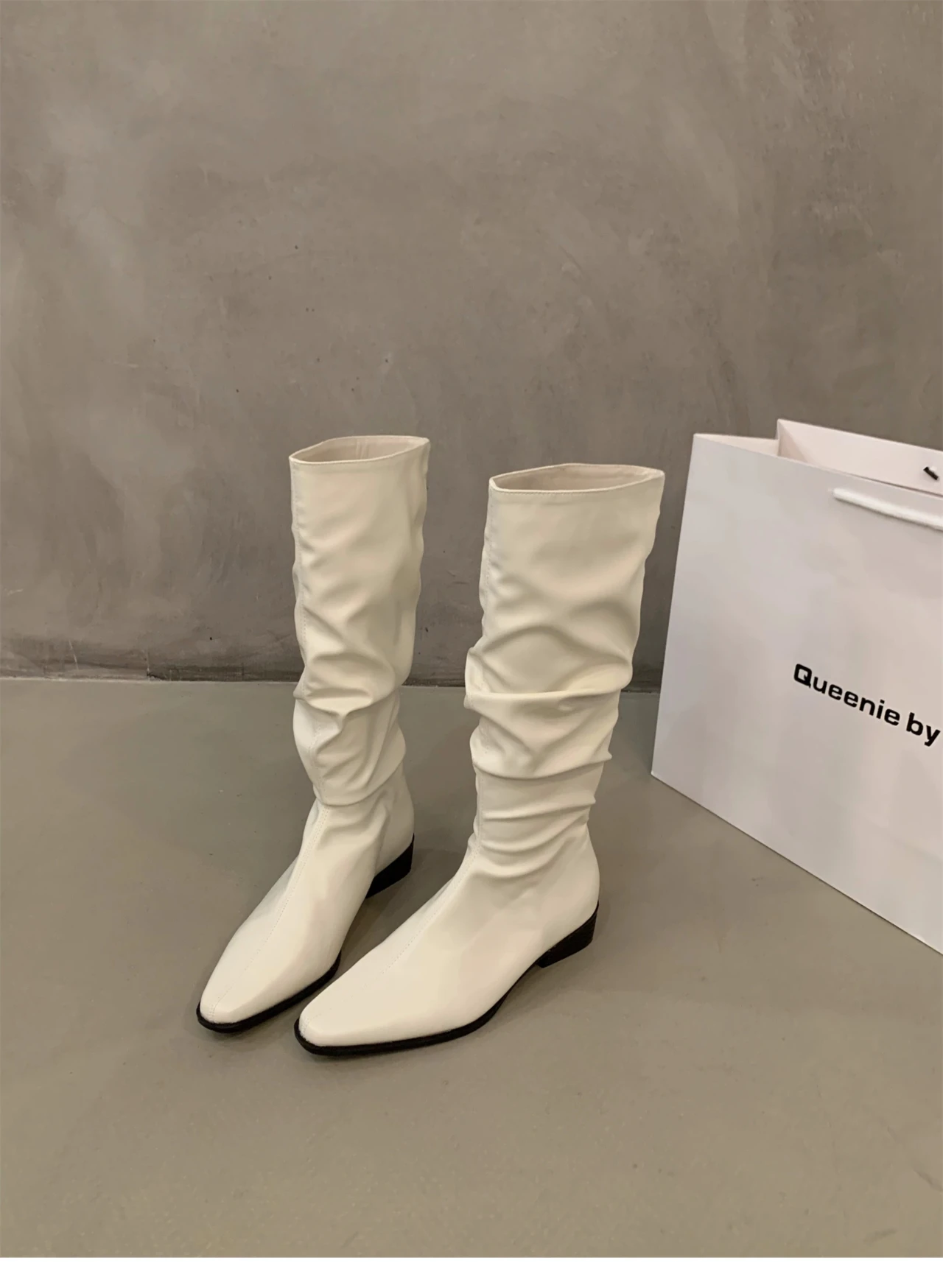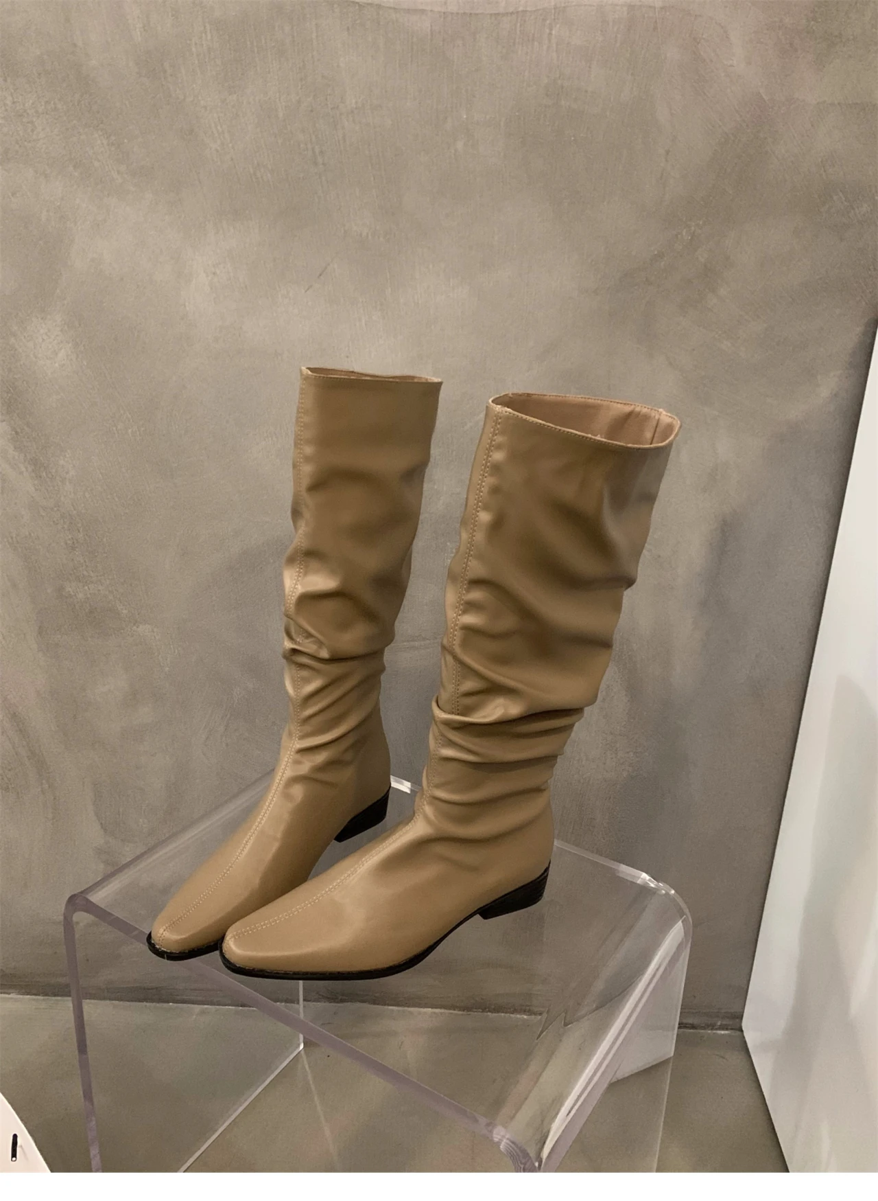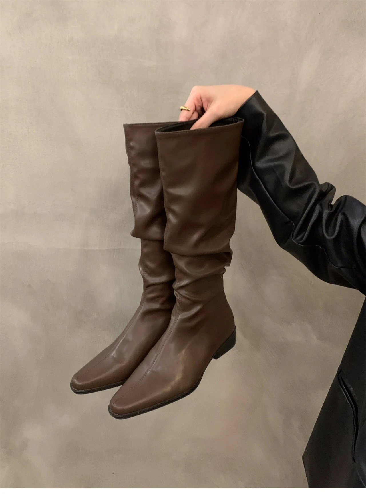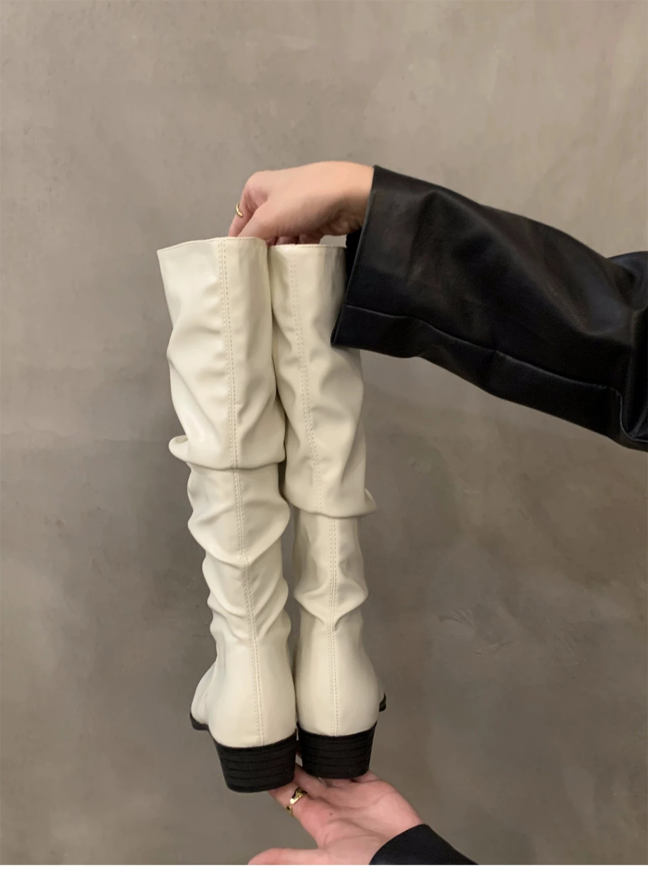 - > Botas altas para o joelho feminino, sapatos femininos, dobras deslizantes, salto baixo, dedo do pé redondo, plano, longo, moda, outono, inverno