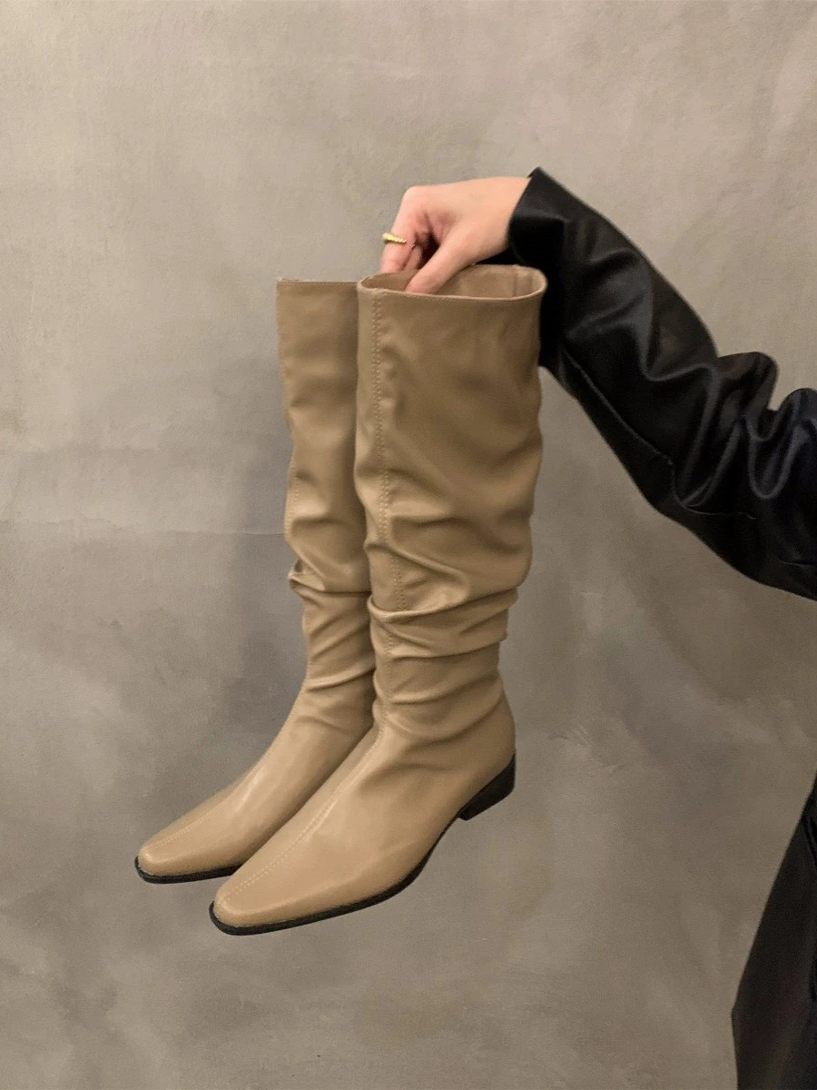 Botas altas para o joelho feminino, sapatos femininos, dobras deslizantes, salto baixo, dedo do pé redondo, plano, longo, moda, outono, inverno