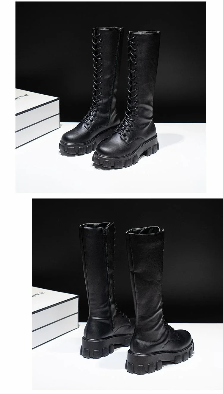 - > Botas de cano médio femininas sapatos acolchoados joelho alto tênis de inverno estilo punk militar casual branco preto 2024 lucury plataforma mulher