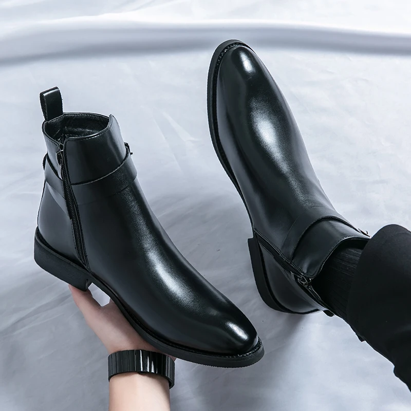 - > Botas de couro macio chelsea para homens, botas pontiagudas, estilo britânico casual, sapato alto curto, moda empresarial clássica
