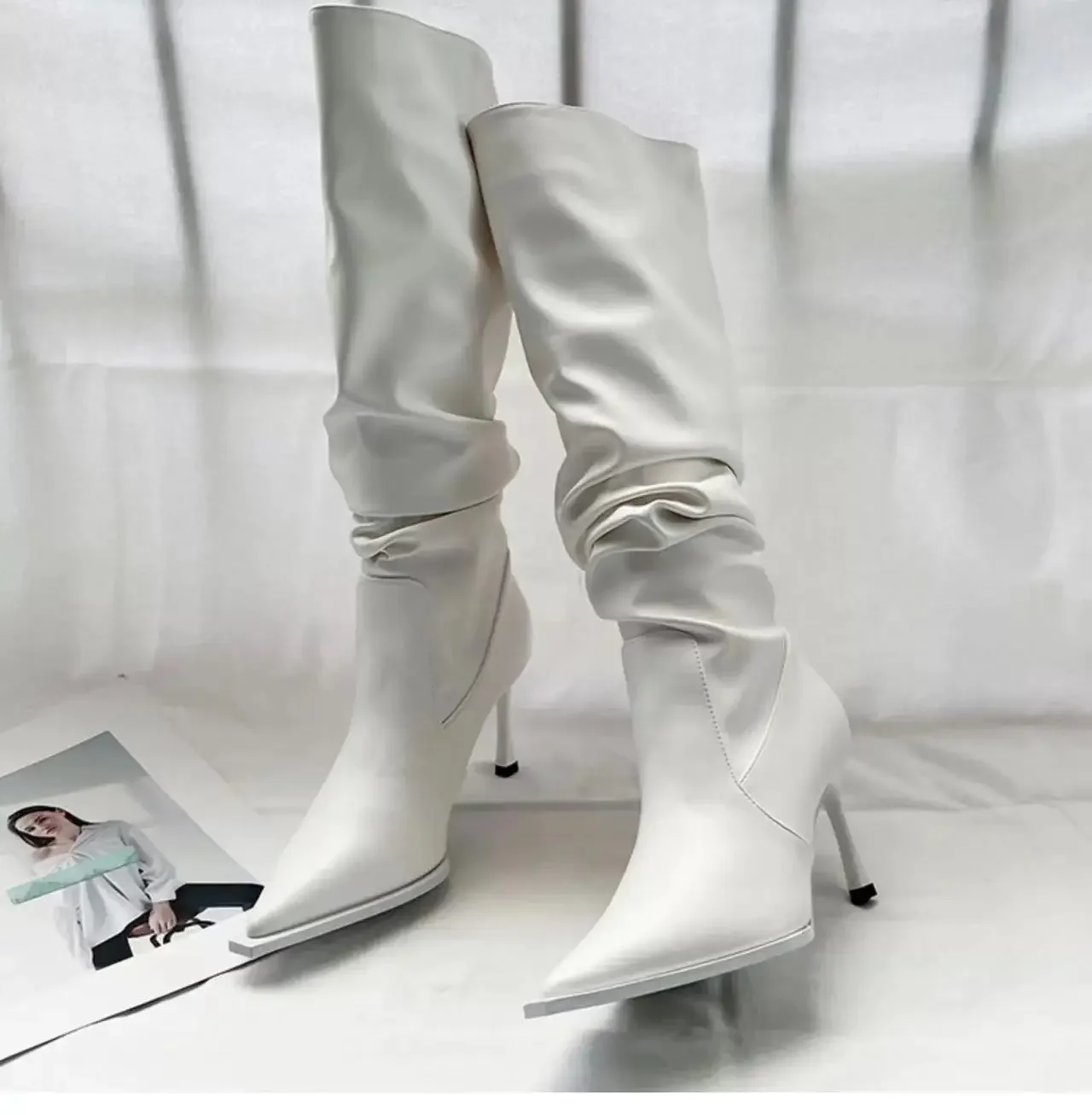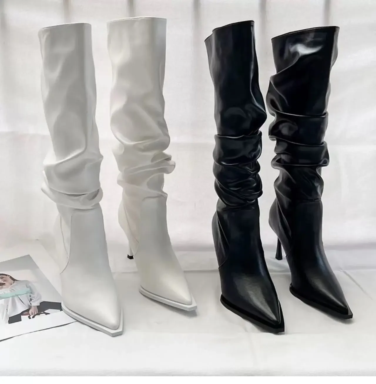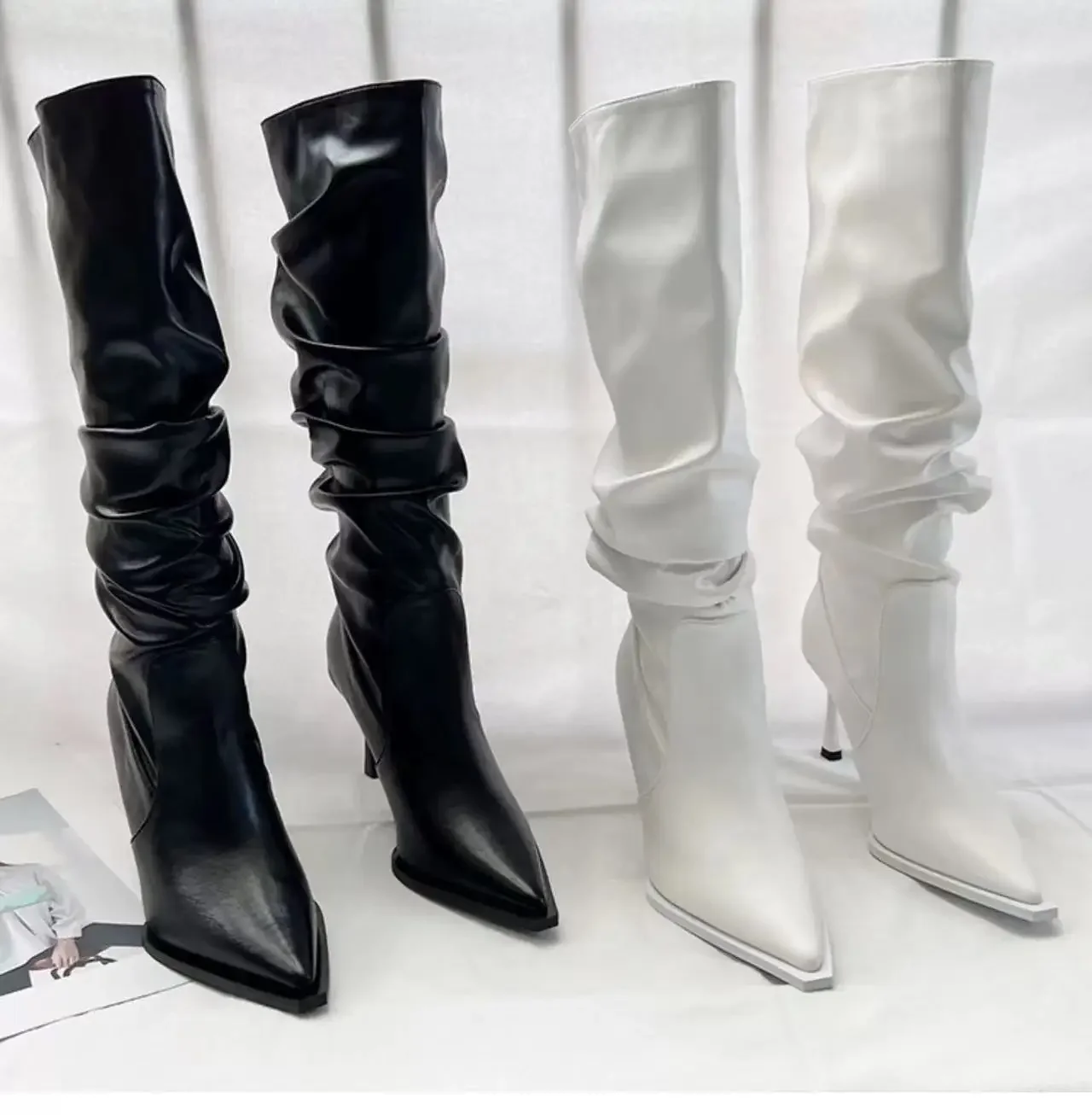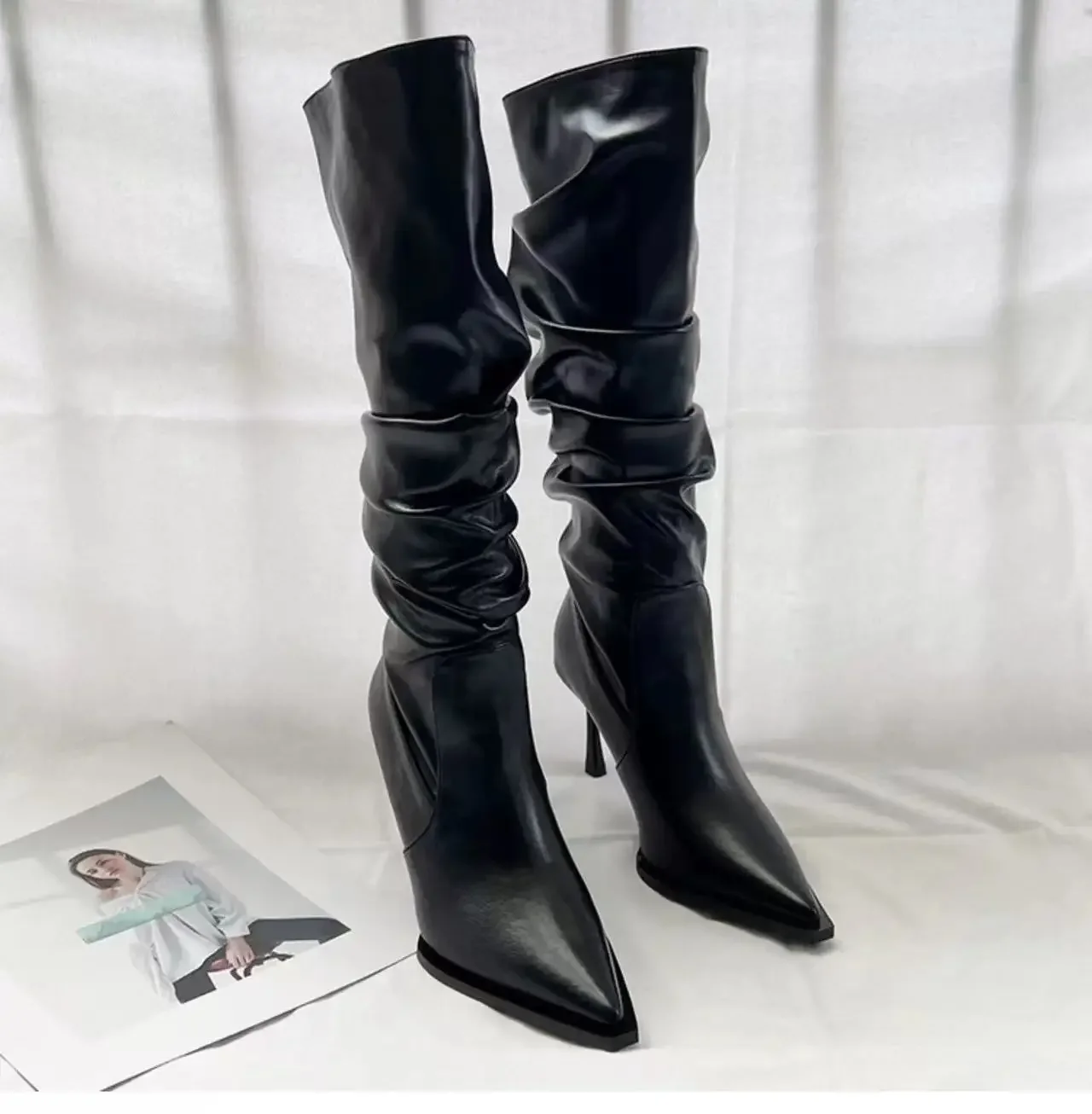 - > Botas femininas plissadas pontiagudas de cano alto, botas de salto fino na moda, botas longas abaixo do joelho, outono, 2024
