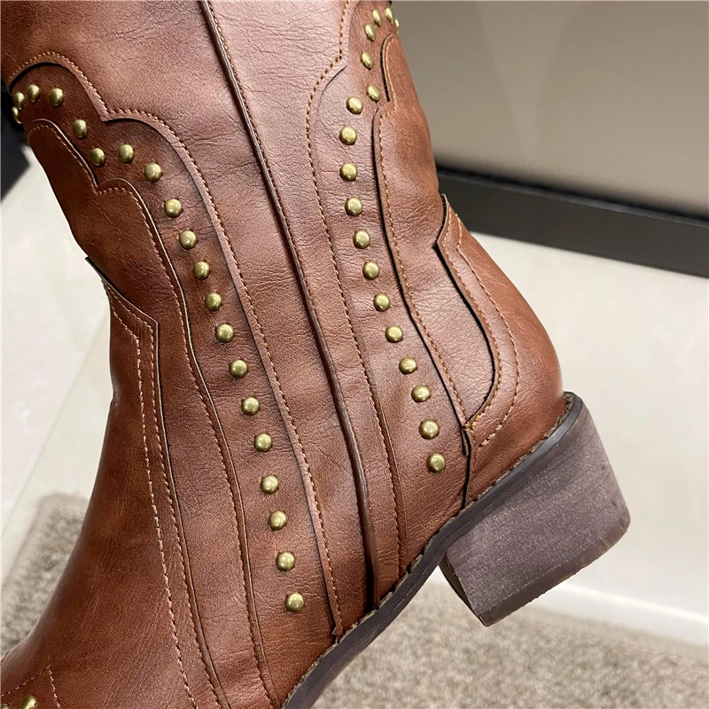 Botas góticas cravejadas para mulheres, joelho alto, couro curto, salto baixo, vaqueiro ocidental, designer de luxo, sapatos de rock novos, vintage, ocidental, 2024