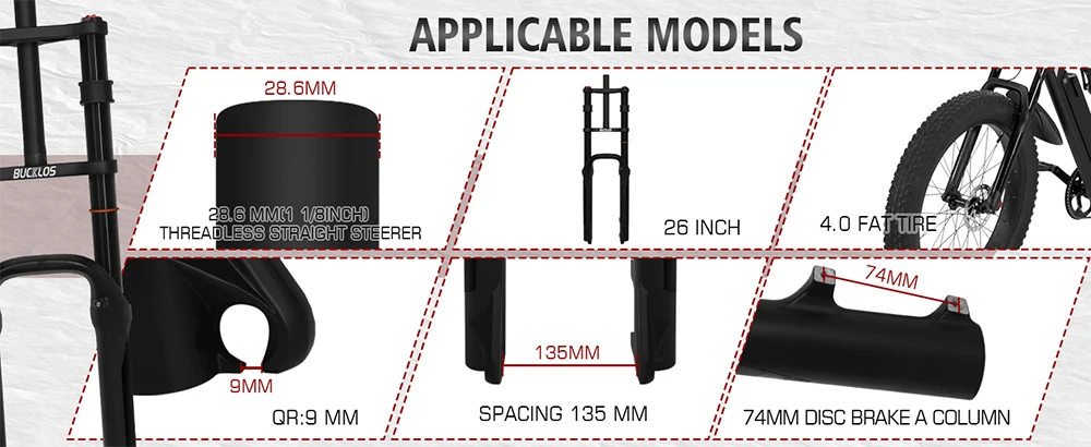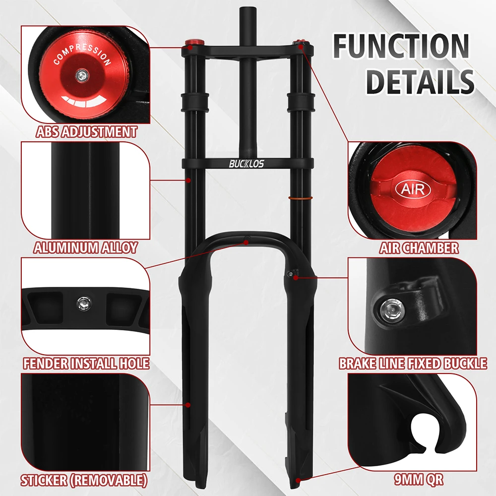 - > Bucklos 26*4.0 garfo de bicicleta de neve suspensão a ar garfo gordo 4.0 pneu 9*135mm garfos de mountain bike praia e-bike garfos