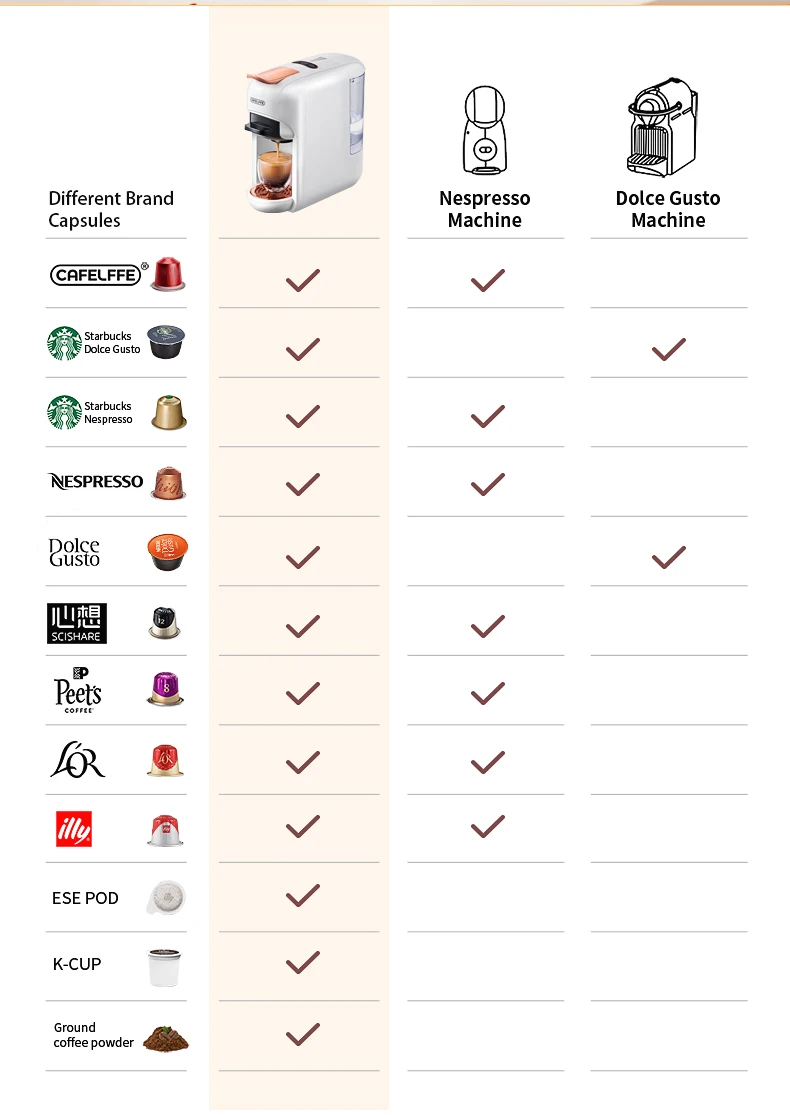 ★【Design compatível 5 em 1】A máquina de café em cápsulas de café é compatível com cápsula original Nes*, cápsula Dolce Gusto*, cápsula K-cup, cápsulas de café ESE e pó de café.Pode satisfazer uma variedade de necessidades de café, não é necessário comprar máquinas diferentes.