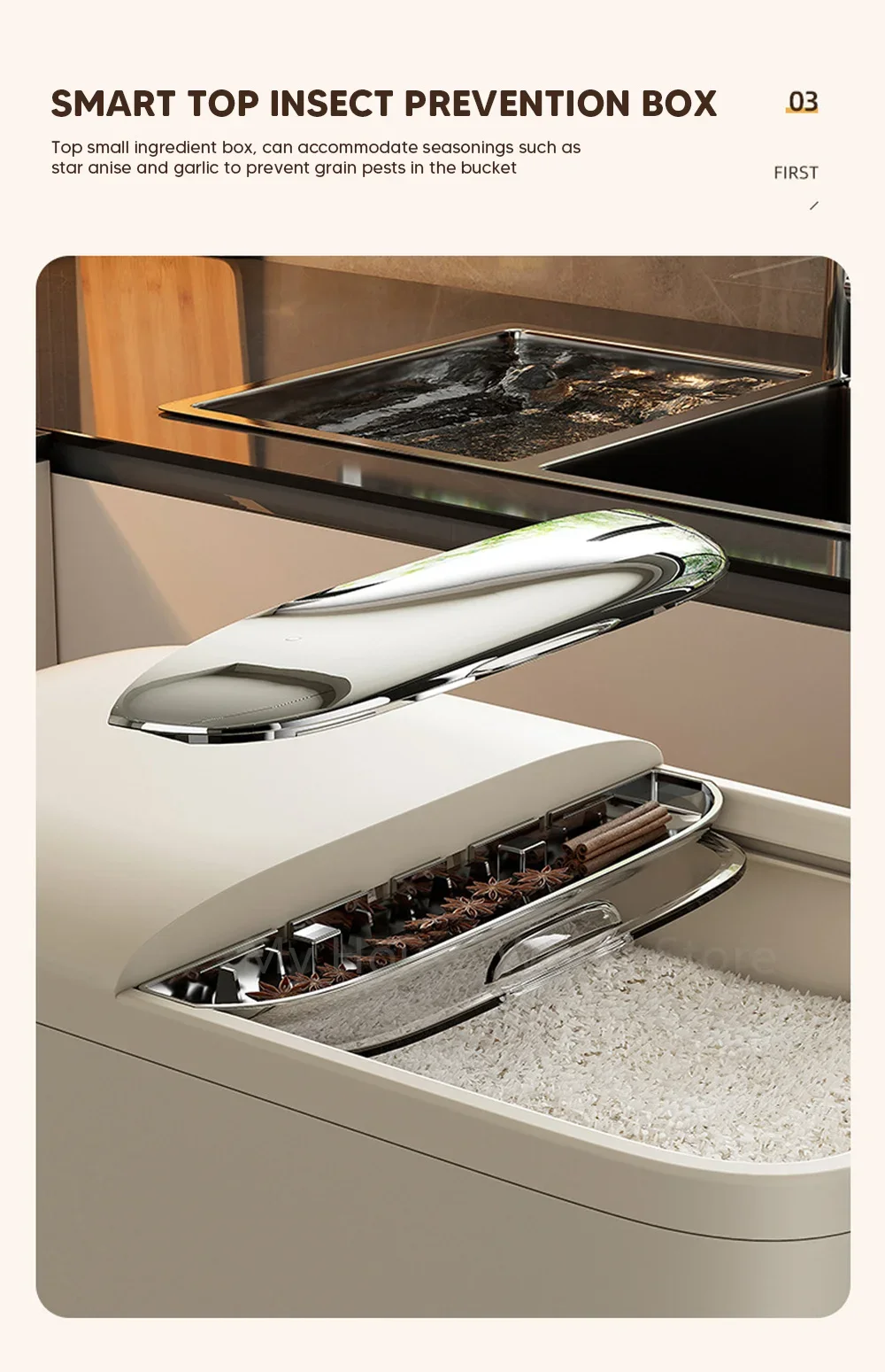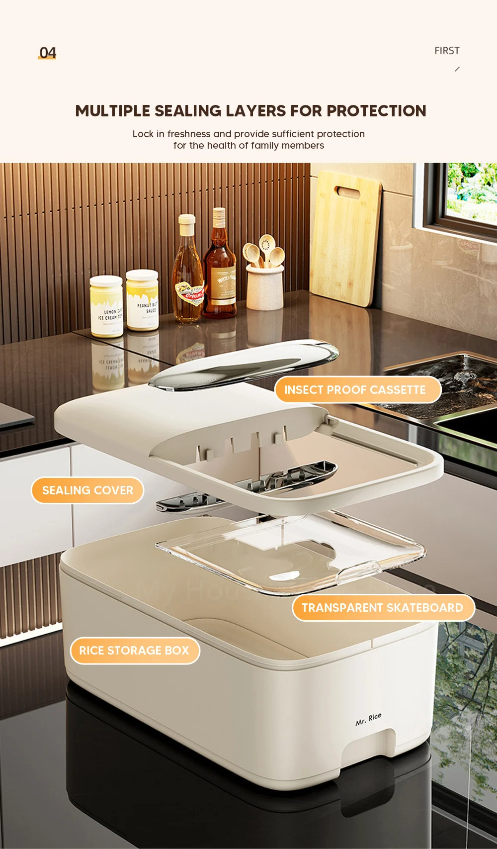 Esta caixa de armazenamento está equipada com uma caixa estendida à prova de insetos, que evita efetivamente a infestação de insetos e a intrusão de umidade, mantendo o arroz seco e fresco.