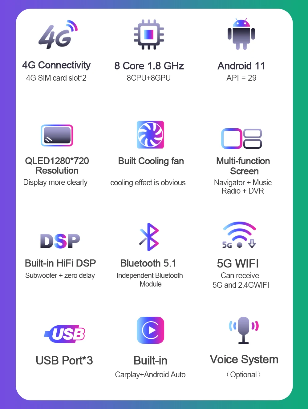 screen display:: QLED9inch 2.5D screen, QLED1280*720 resolution 4G version IPS