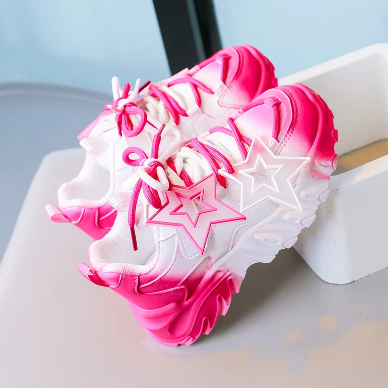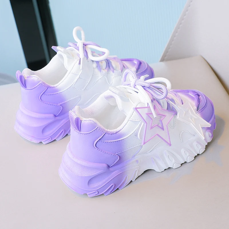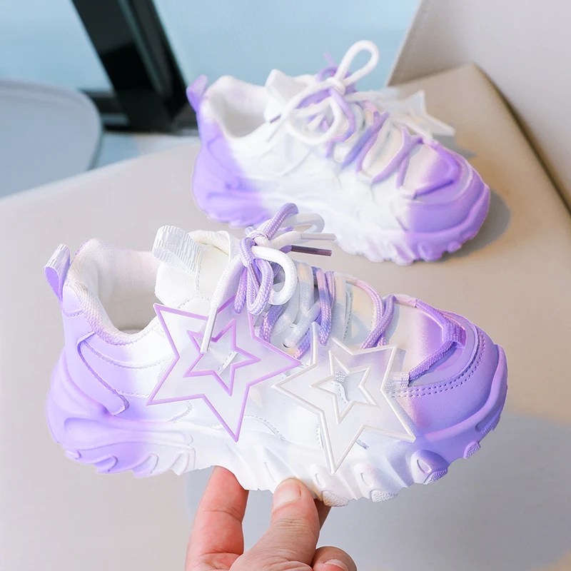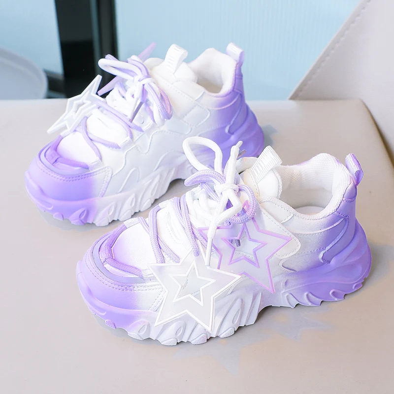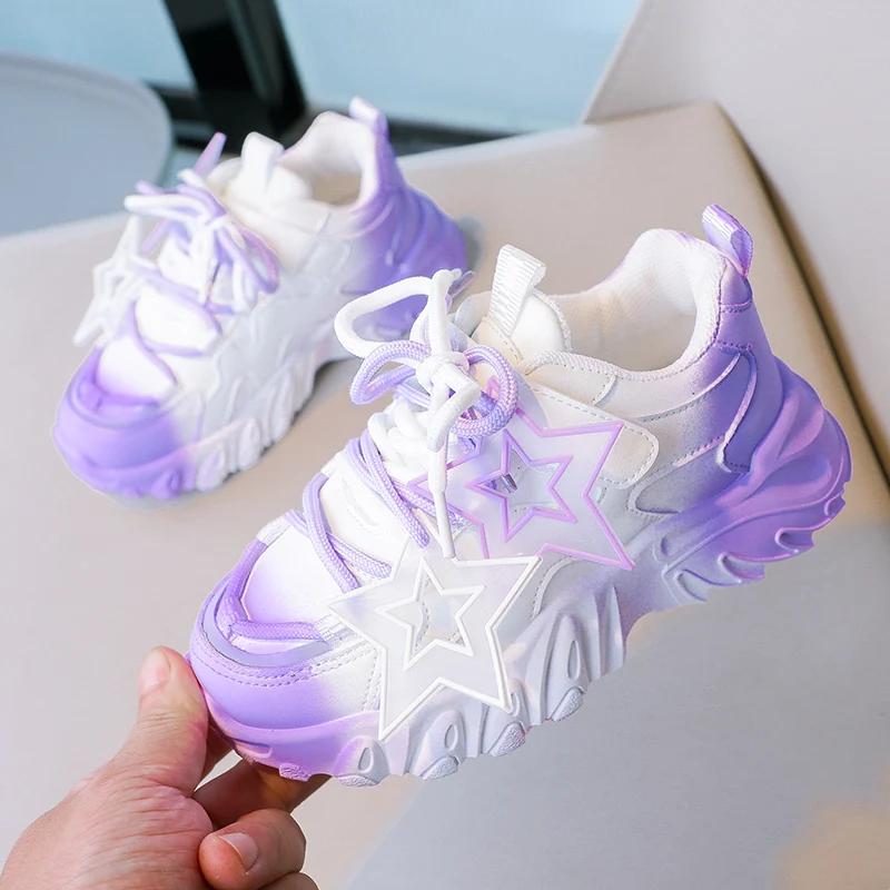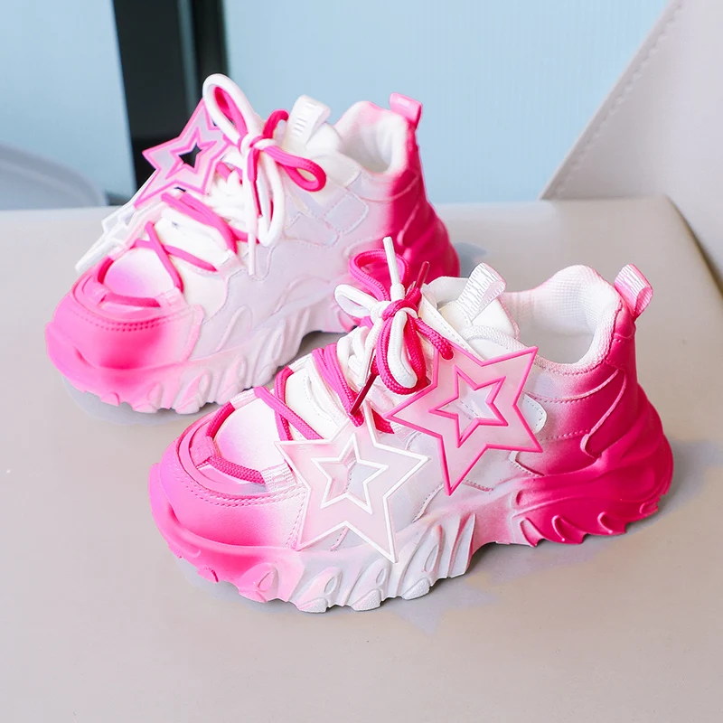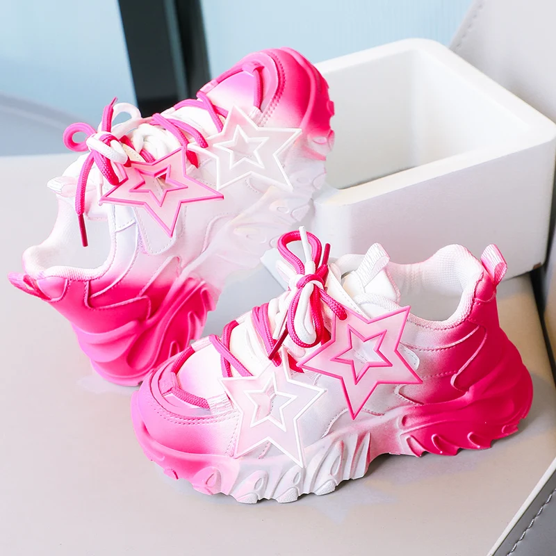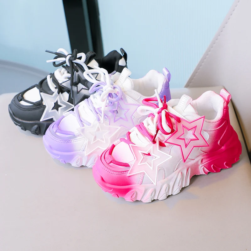 Calçados esportivos infantis respiráveis de cor gradiente, tênis grossos respiráveis para meninas e meninos com decoração de estrela
