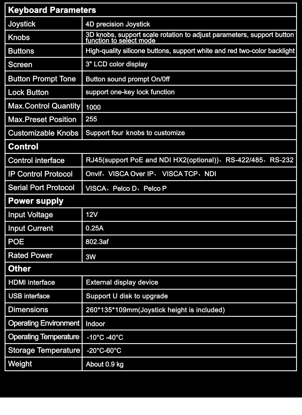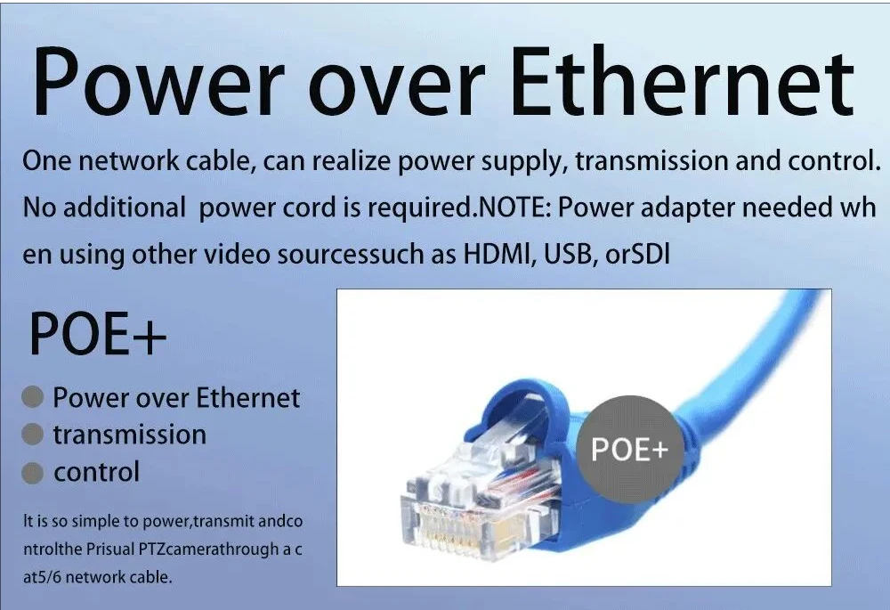 O recurso PoE permite que a câmera receba energia e transmita dados simultaneamente através de um único cabo Ethernet, eliminando o incômodo de colocar cabos de alimentação adicionais.No entanto, é importante observar que ao usar fontes de vídeo alternativas como HDMI, USB ou SDI, é necessário um adaptador de energia.