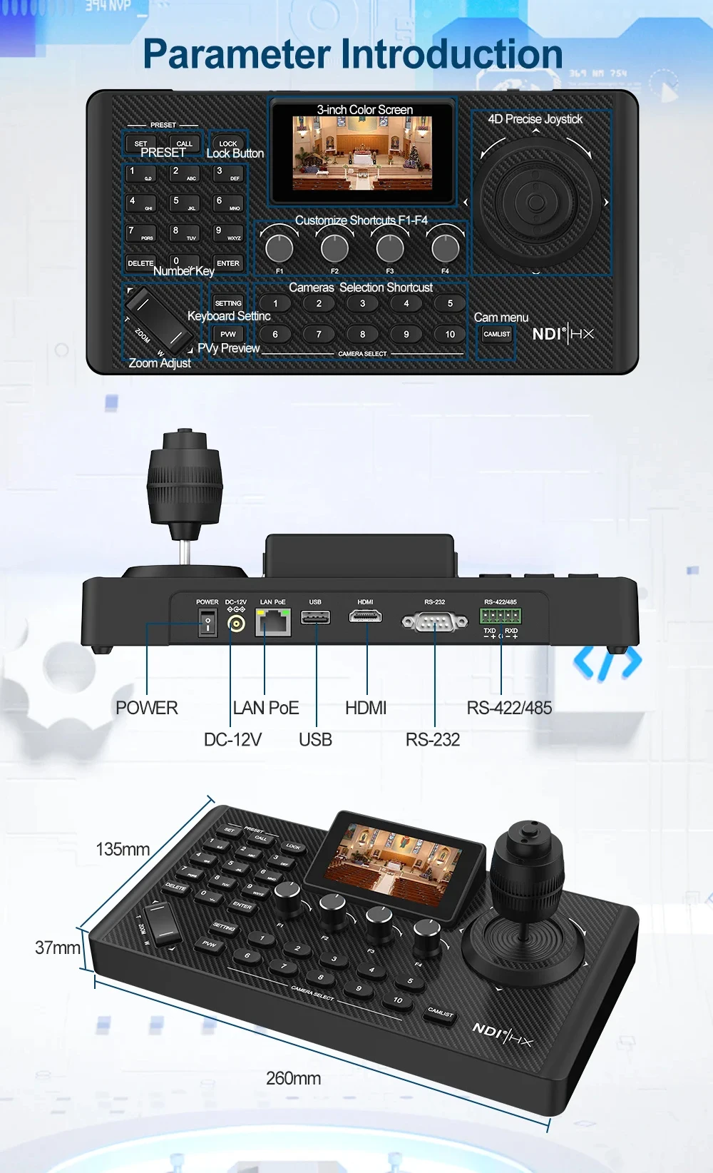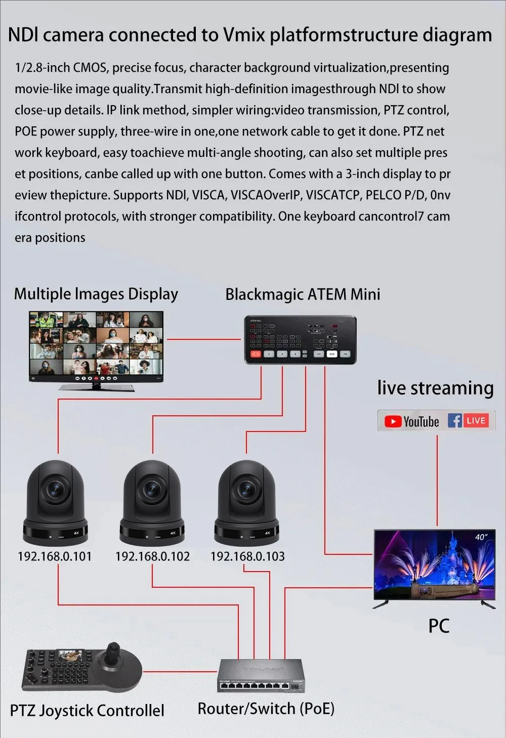 Como uma câmera NDI PTZ profissional endossada pela Newtek Inc, ela incorpora tecnologia NDI avançada e é habilitada para PoE.Com apenas um único cabo Ethernet, ele gerencia sem esforço fonte de alimentação, transmissão de áudio, sinais de controle e streaming de vídeo de baixa latência.Integrando-se perfeitamente com aplicações de vídeo líderes do setor, incluindo OBS, vMix, Livestream Studio e Wirecast, oferece aos usuários uma solução de produção de vídeo conveniente e eficiente.