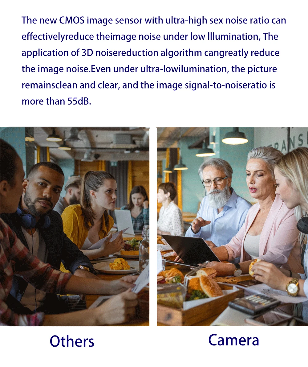 O sensor CMOS de alta relação sinal-ruído, combinado com algoritmos avançados de redução de ruído 2D e 3D, suprime efetivamente o ruído, garantindo imagens nítidas e limpas mesmo em condições de pouca luz.