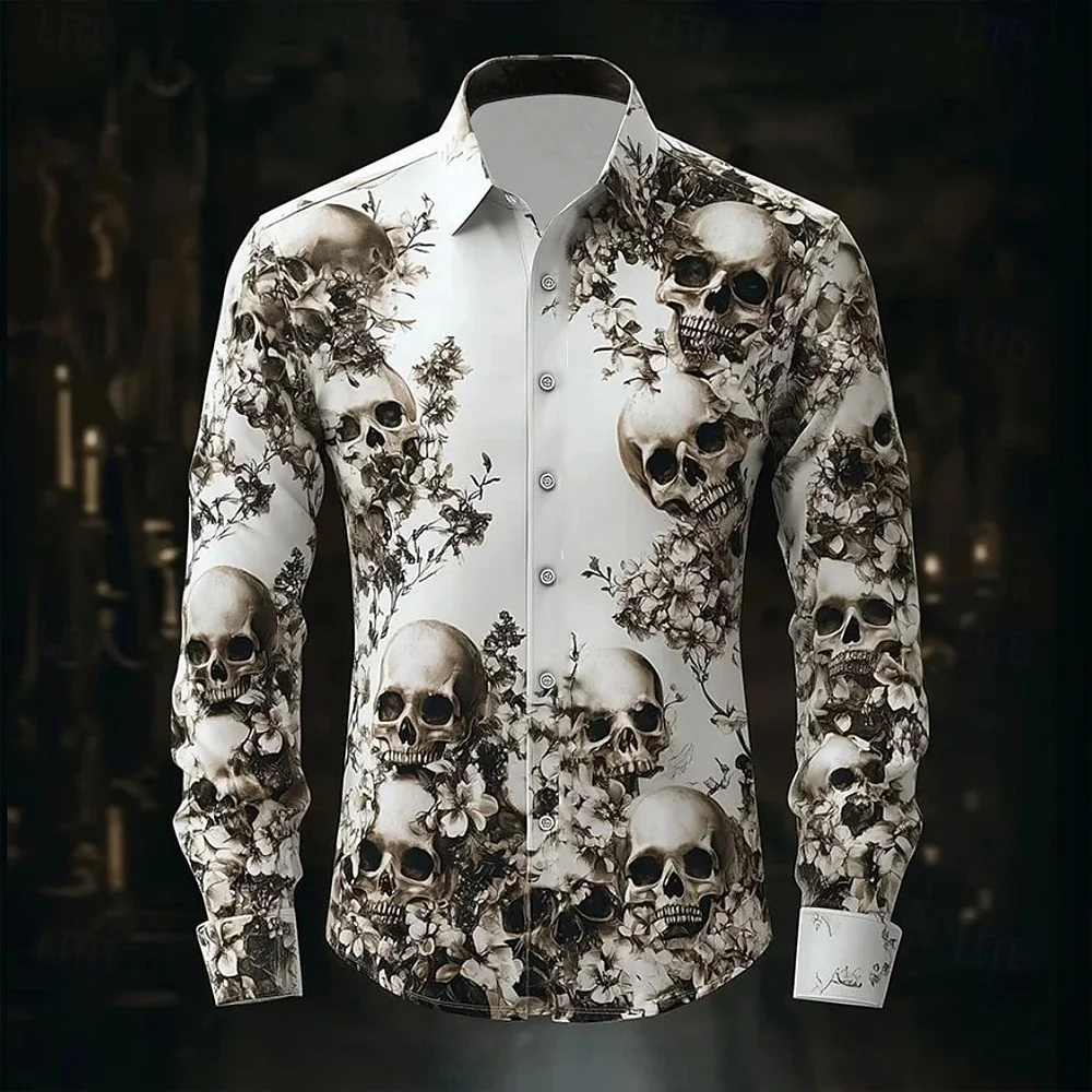 Camisa masculina com estampa de caveira, camisa clássica de festa de Halloween, camisa com botão de lapela de manga comprida, top confortável com design de designer
