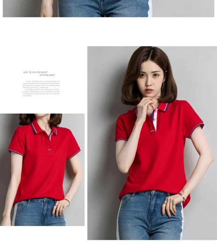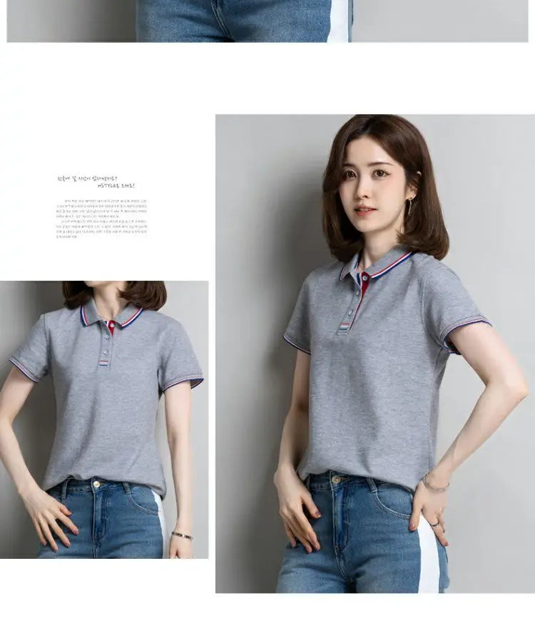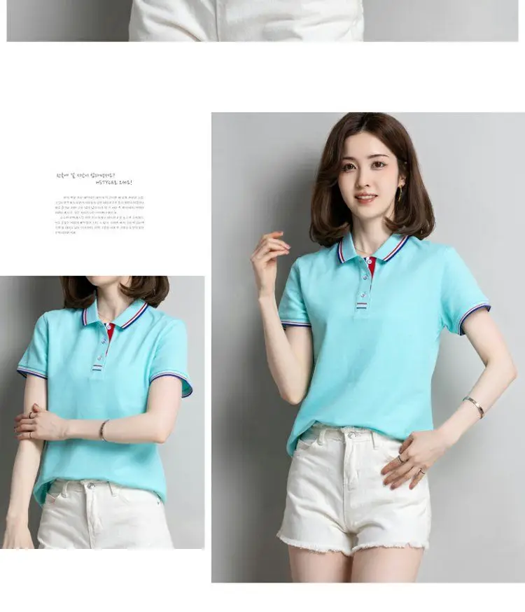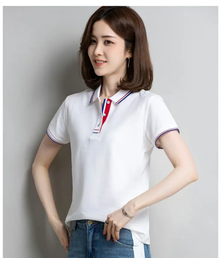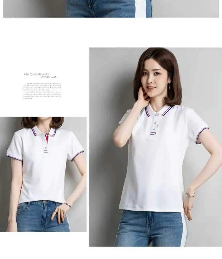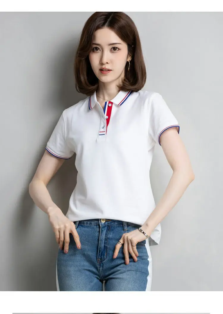 Camisa polo feminina de algodão solto, manga curta, blusa esportiva casual com lapela, camisa de negócios preto e branco, verão feminino