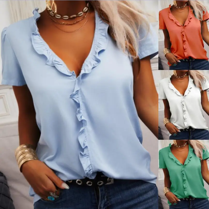 Camisa solta azul clara para mulheres, camisa babada monocromática, blusa de manga curta, pulôver elegante, blusa senhora do escritório, verão 2022