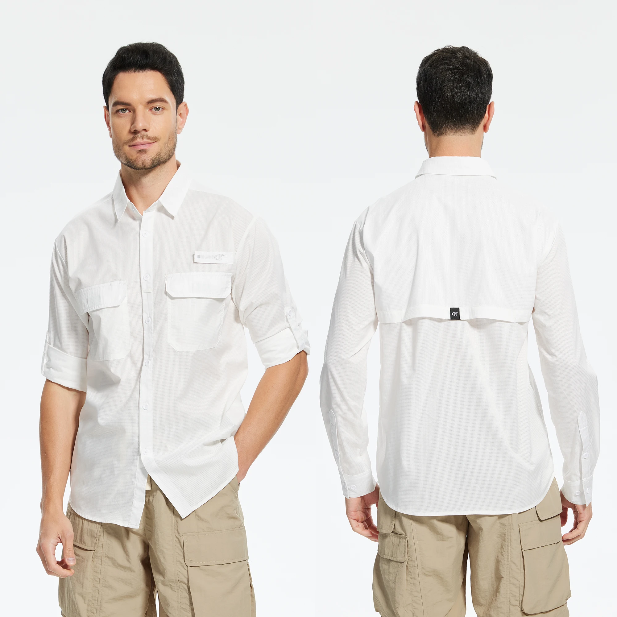Função Adicional: Mangas enroladas com suportes de abas ocultos, convertem-se facilmente em uma camisa de trabalho de manga curta.Um porta-canna oferece conveniência para as mãos livres.Um limpador de óculos embutido na bainha.