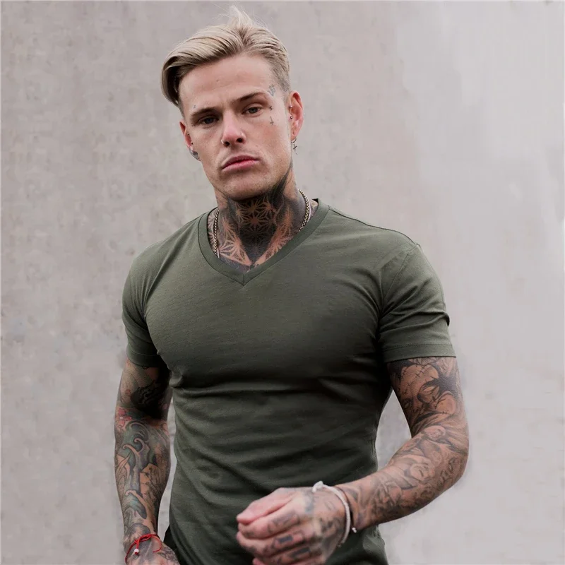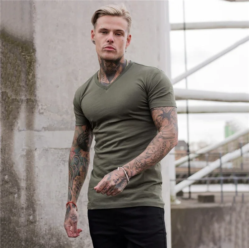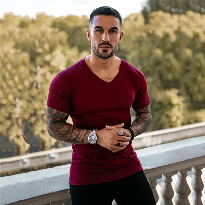 - > Camiseta de manga curta para musculação masculina, camiseta esportiva, roupa de algodão, gola V, respirável, ginástica, fitness, treino, verão