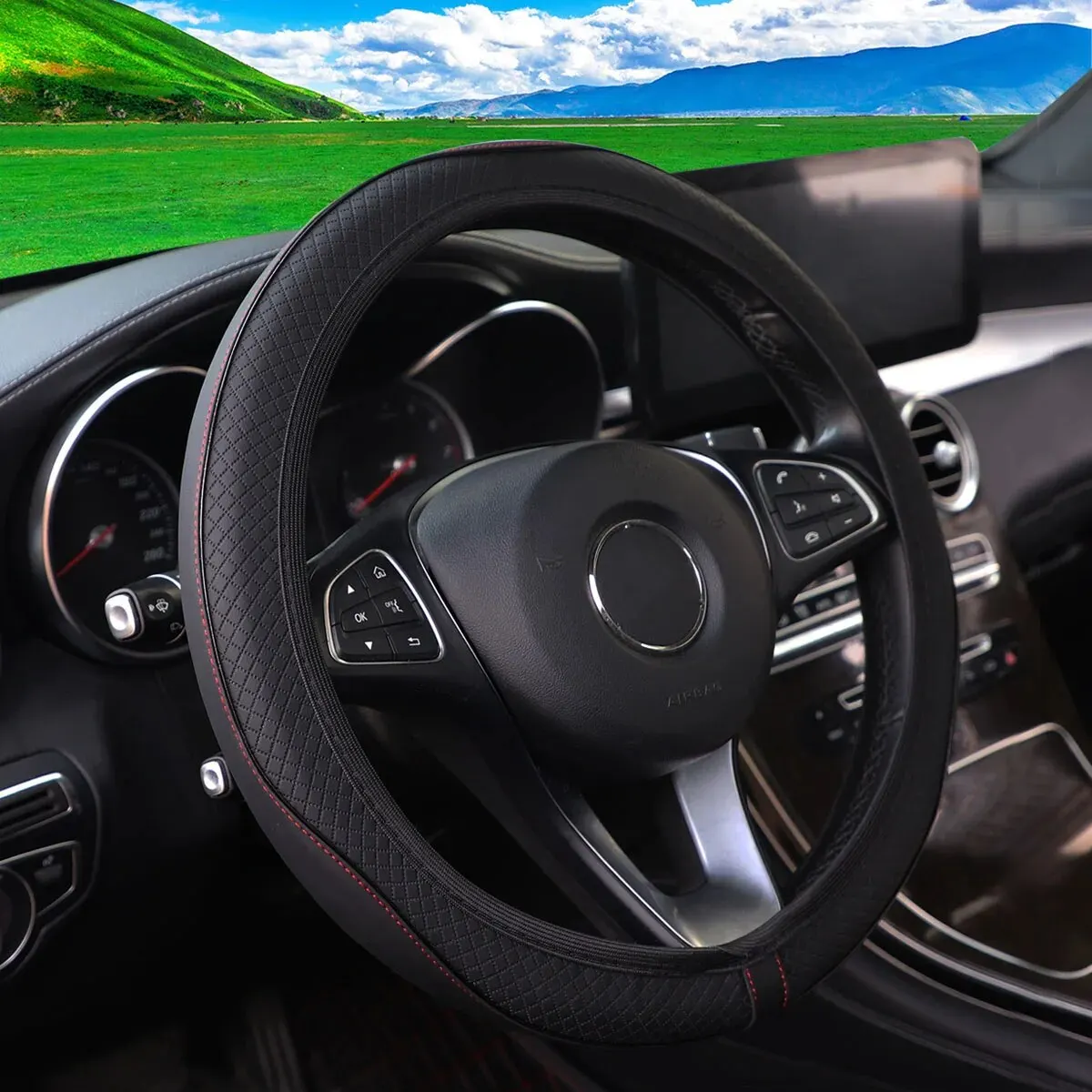 - > Capa de couro com sensação de pele, listra colorida, carro embaçado, sem anel interno, capa de volante, suprimentos automotivos, 14,5-15 polegadas