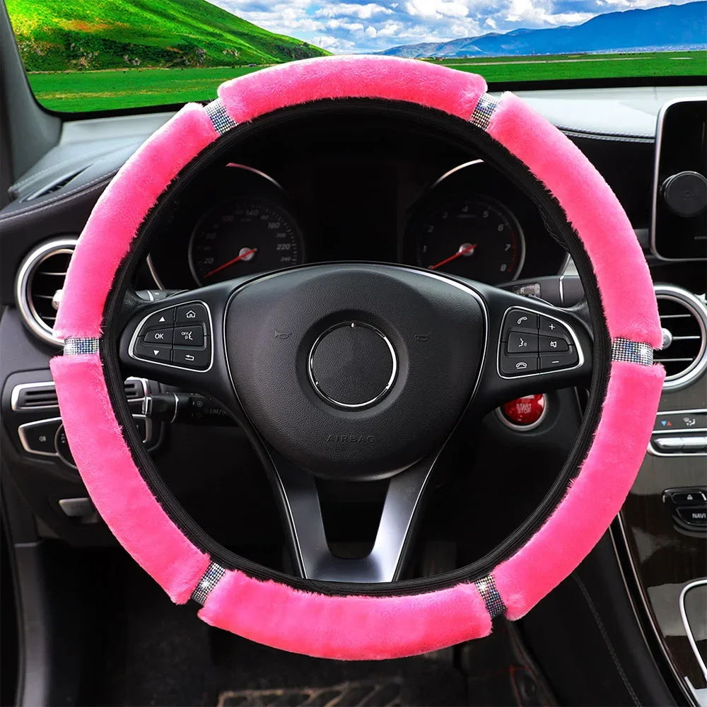 Capa de volante de carro de pelúcia macia strass acessórios interiores de inverno 37-38cm capa de direção estilo de carro para mulher