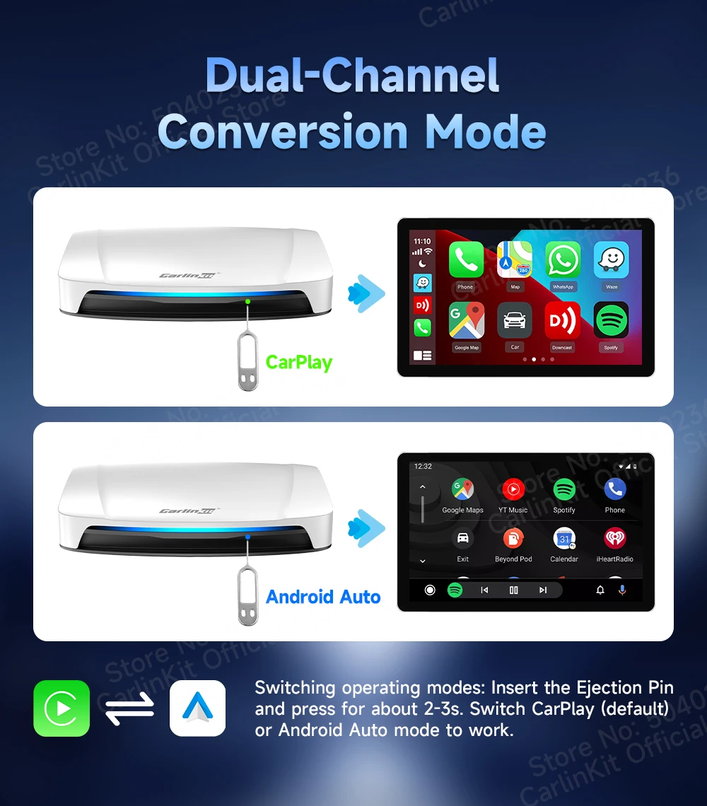A luz verde é CarPlay, a luz azul é Android Auto, alternando os modos de operação: insira o pino de ejeção e pressione por cerca de 2-3s.Mude o modo CarPlay (padrão) ou Android Auto para funcionar.