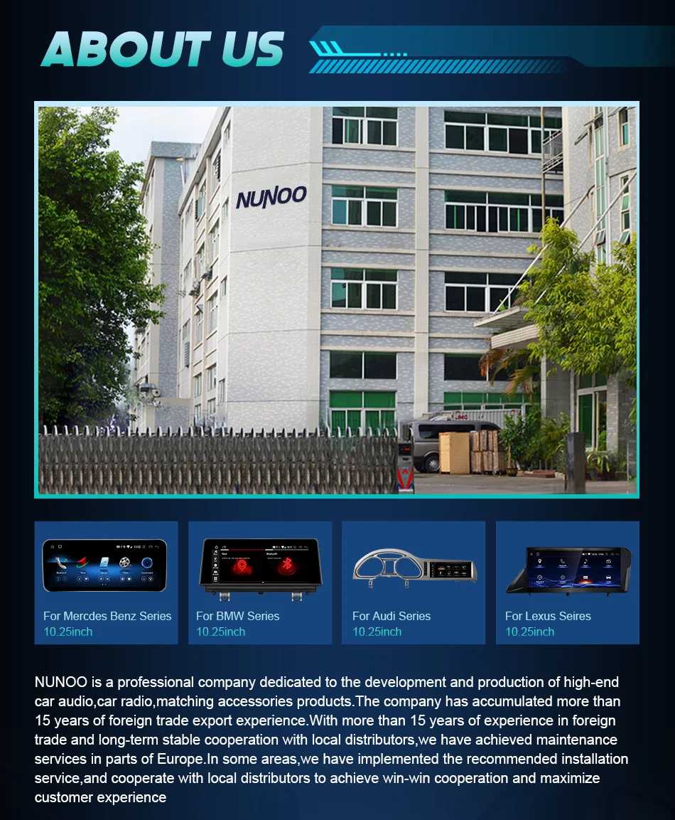 1.NUNOO é as principais marcas do AliExpress, 15 anos de produção e vendas profissionais.vendemos principalmente para multimídia automotivo Audi BMW BENZ LEXUS, popular entre os clientes.nosso objetivo é fornecer o melhor produto e serviço para nossos clientes, também fornecer atualização gratuita de firmware
