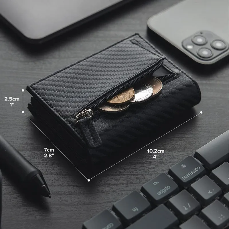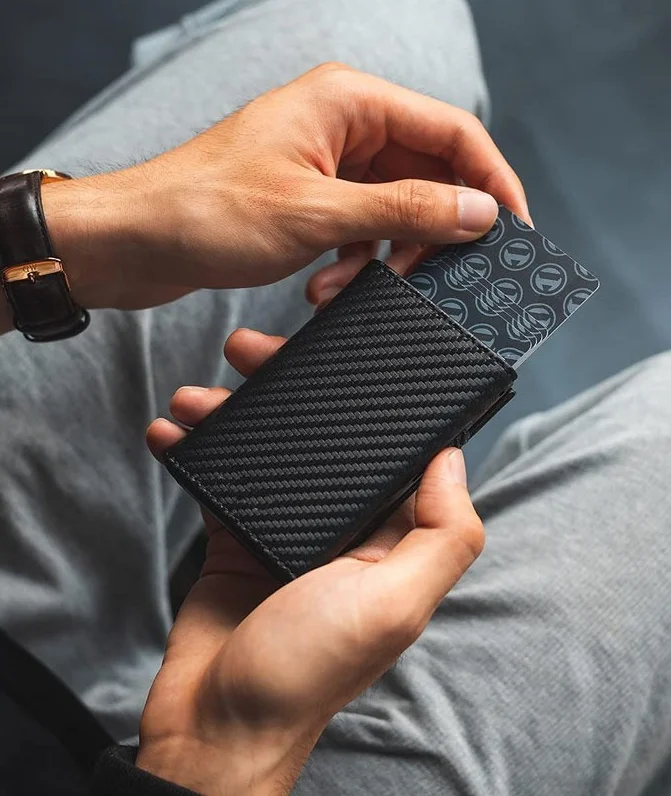 - > Carteira bifold masculina de fibra de carbono e alumínio - porta-cartões pop-u