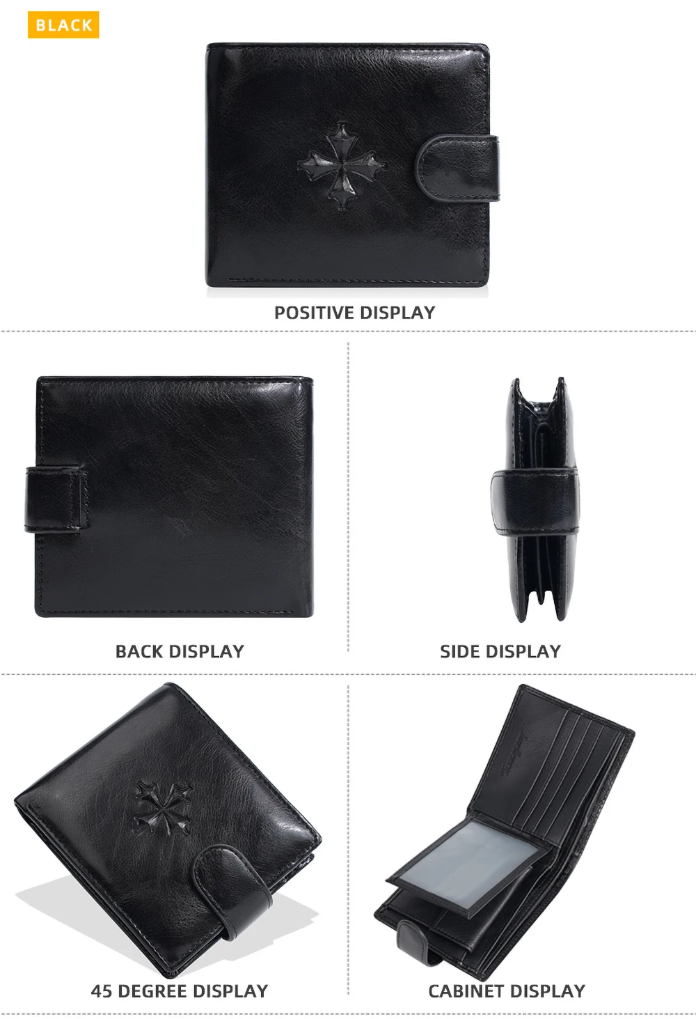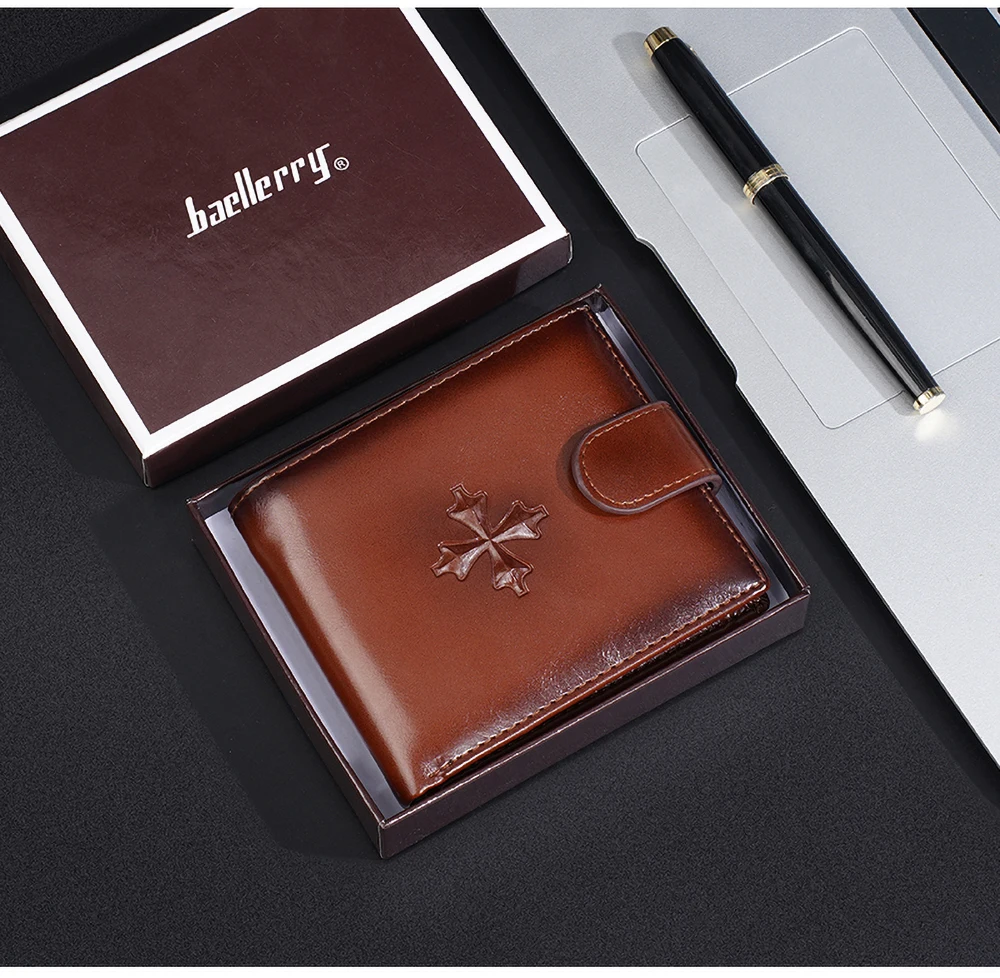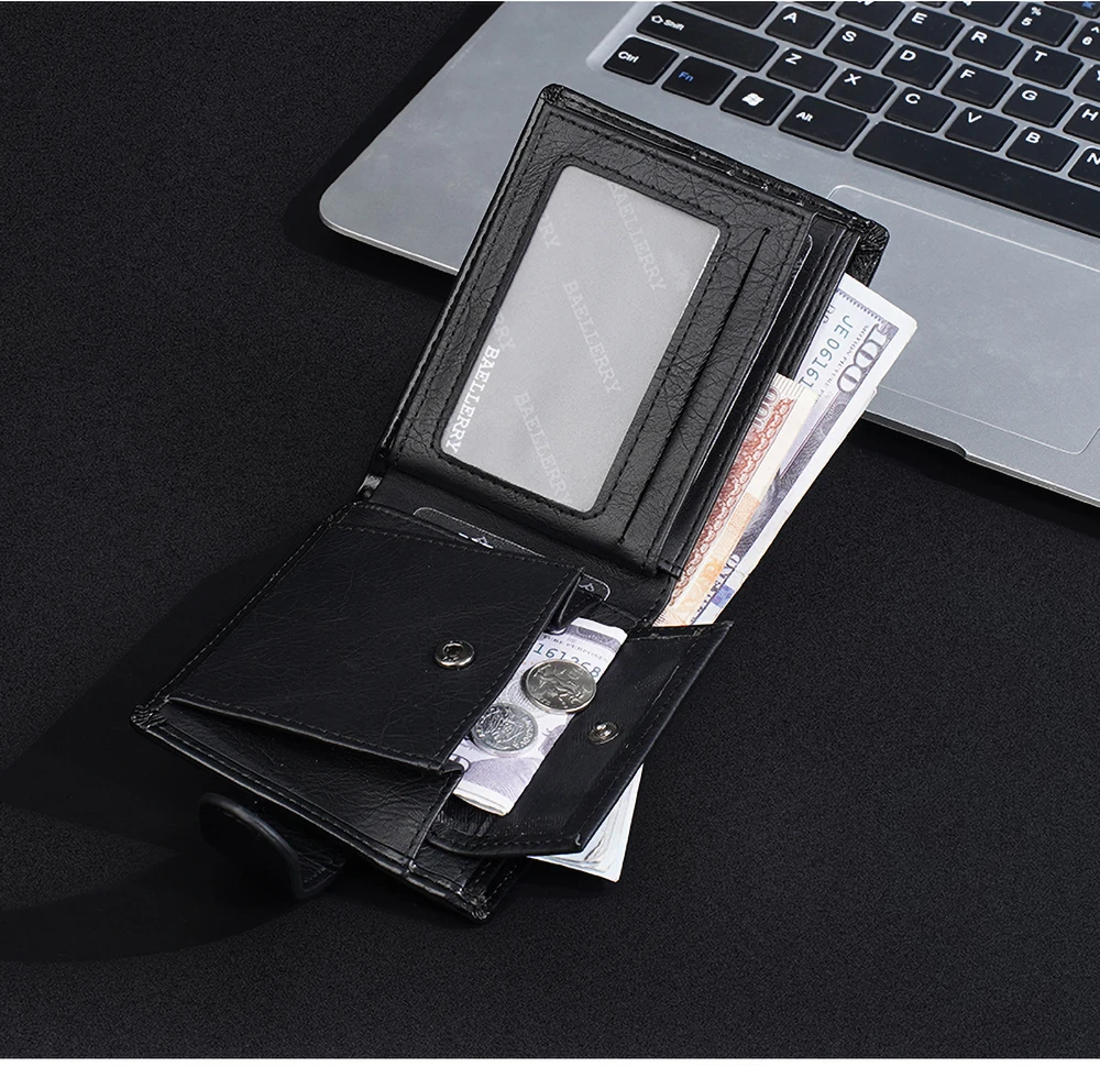 - > Carteira masculina de couro genuíno Baellery curta bifold, organizador de dinheiro de grande capacidade com vários slots para cartões, bloqueio RFID