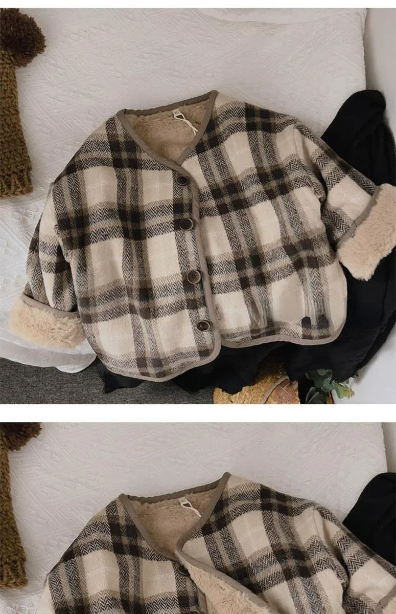 - > Casaco de pelúcia xadrez de lã infantil versão coreana outono e inverno novos casacos para meninos e meninas soltos roupas acolchoadas de algodão para bebês