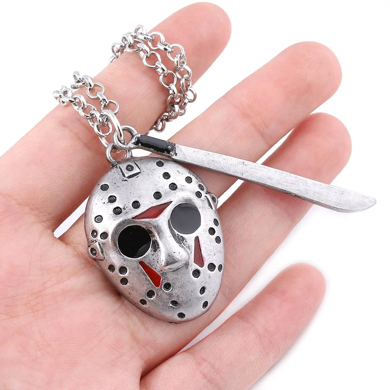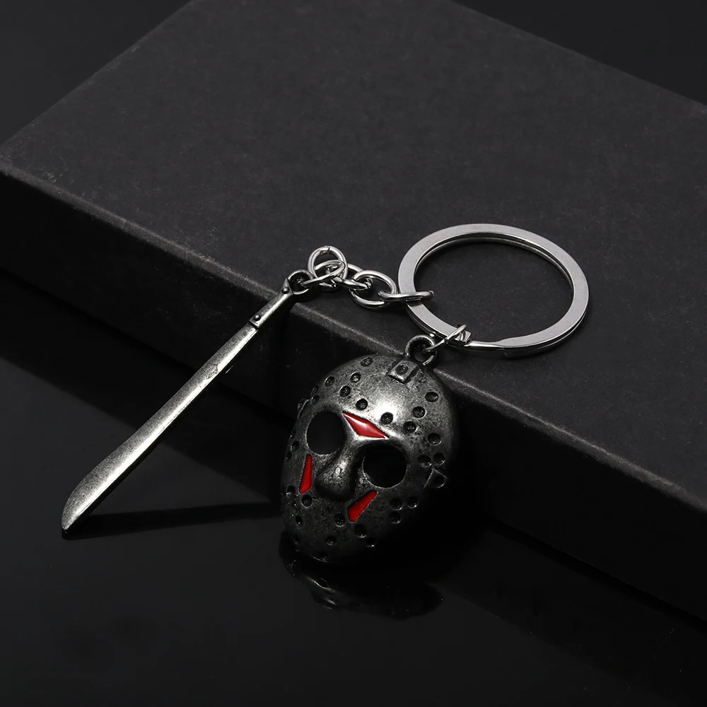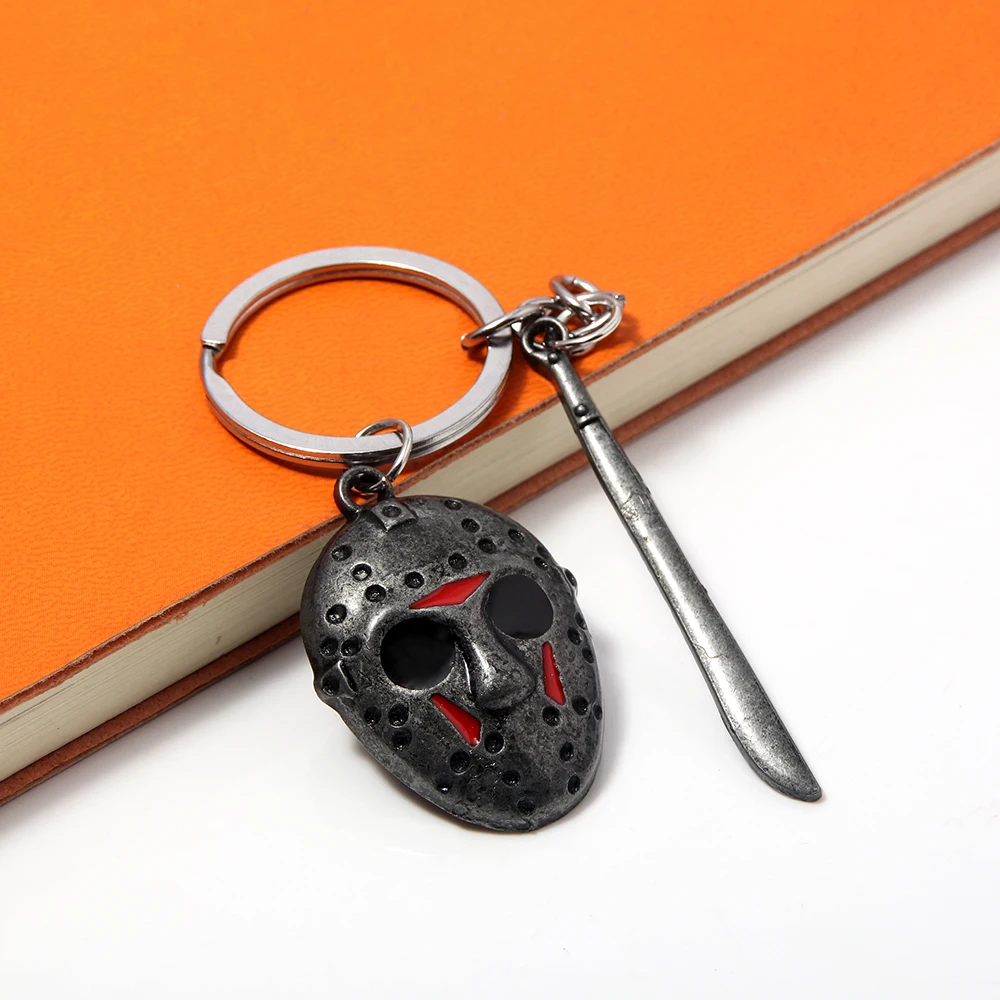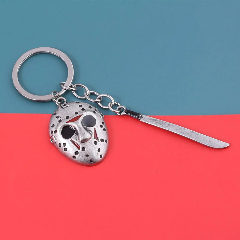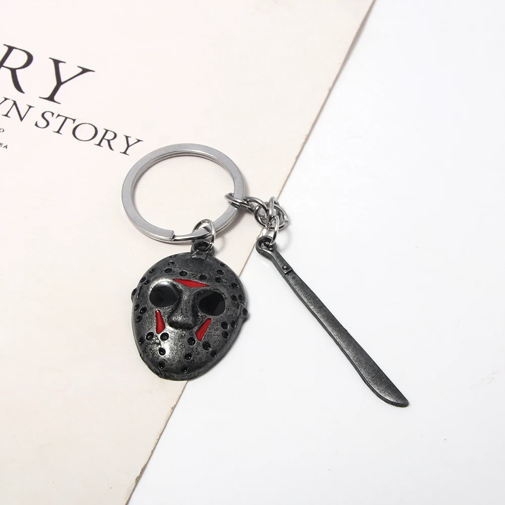 - > Chaveiro de filme de terror, dia das bruxas, jason, máscara de hóquei, facão, metal, pingentes, adereços de cosplay para homens, mulheres, mochila, joias