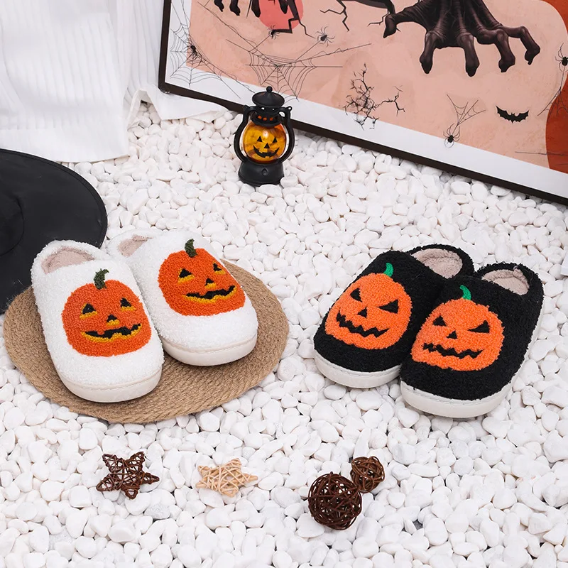 Chinelos de abóbora de halloween aconchegantes mulheres de pelúcia macia antiderrapante slides de algodão interior mulher manter quente confortável chinelos de casa de inverno