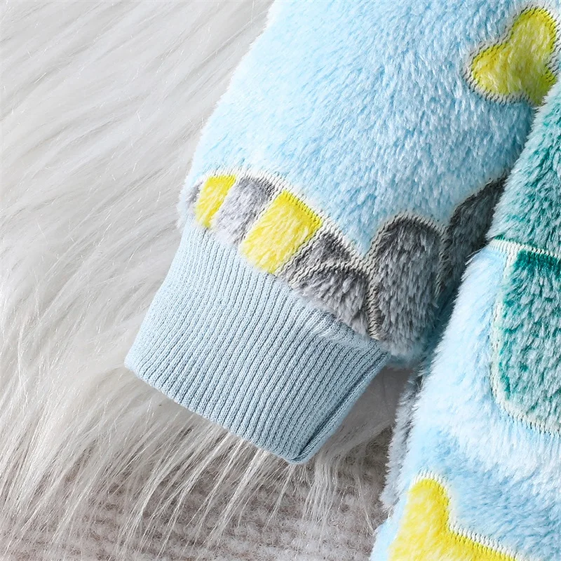 Macacão de manga comprida para bebê menino com tecido de pelúcia, lindo padrão de dinossauro, capuz e mangas compridas, fecho de botão frontal, fácil de colocar e tirar, deixa seu bebê mais atraente ao usá-lo