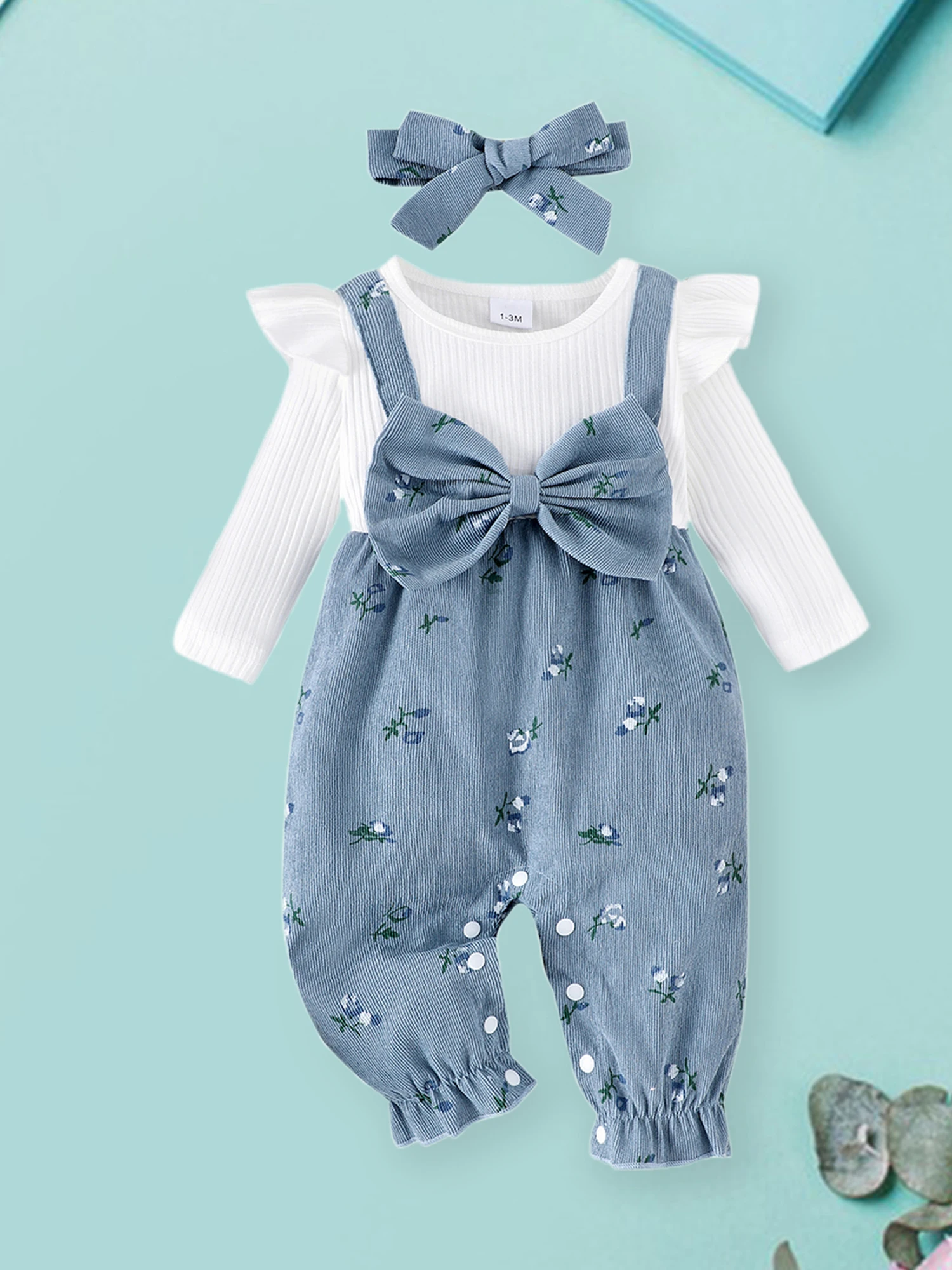 Macacão de manga comprida para bebês meninas com estampa floral falsa de duas peças com laço de retalhos e conjunto de faixa de cabeça fofaRecursos