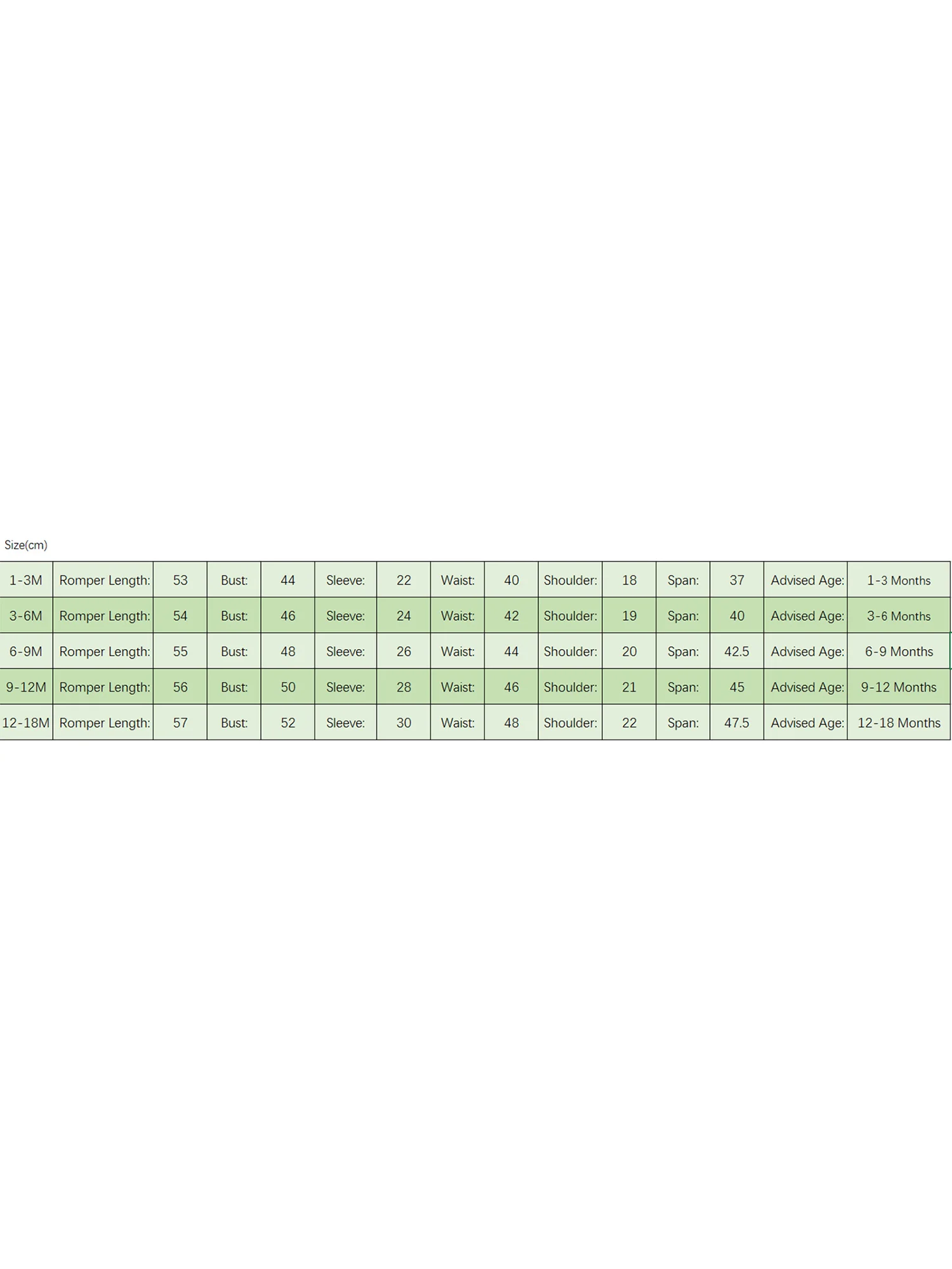 1-3M Comprimento: 53 Busto: 44 Manga: 22 Ombro: 18 Cintura: 40 Idade recomendada: 1-3 meses