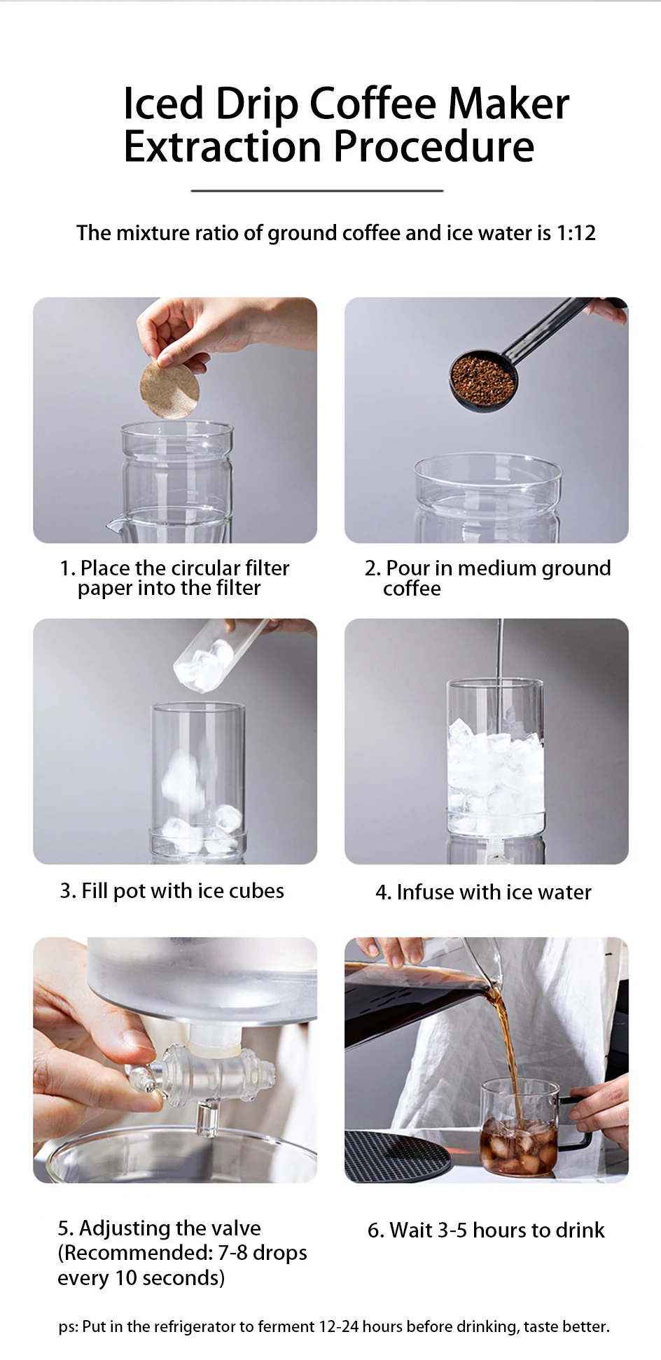 * Ajuste externo da velocidade do gotejamento e controle fácil. Ajuste a velocidade de gotejamento da esquerda para a direita, recomende 7-8drops em 10 segundos. O tempo de extração é de 4-6H e pode ser bebido ou armazenado na geladeira após o gotejamento.