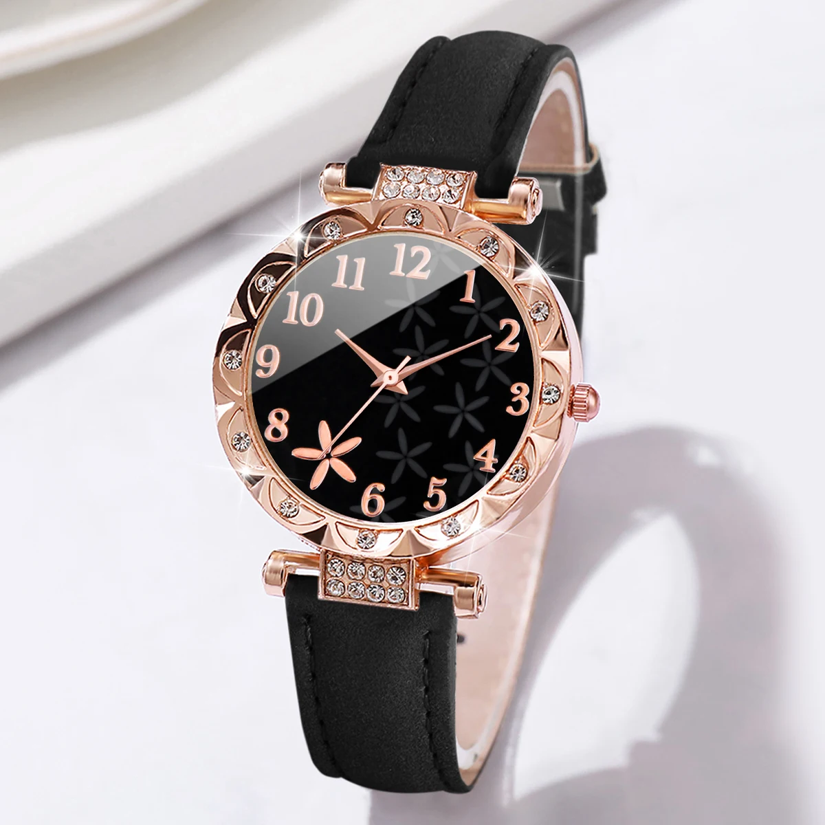 - > Conjunto de braceletes de coração strass feminino, relógio de pulso quartzo feminino, mostrador flor, pulseira de couro, 2 peças por conjunto