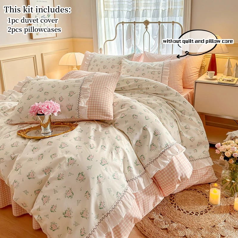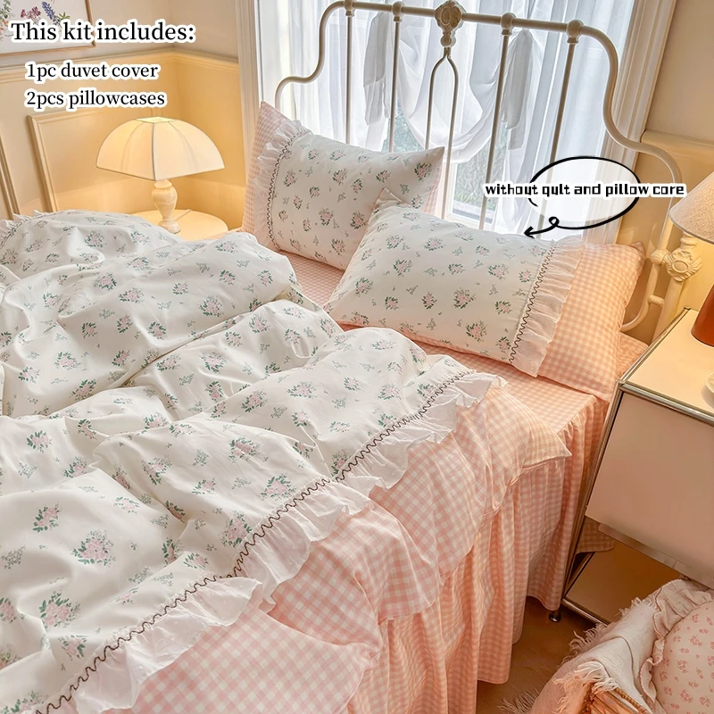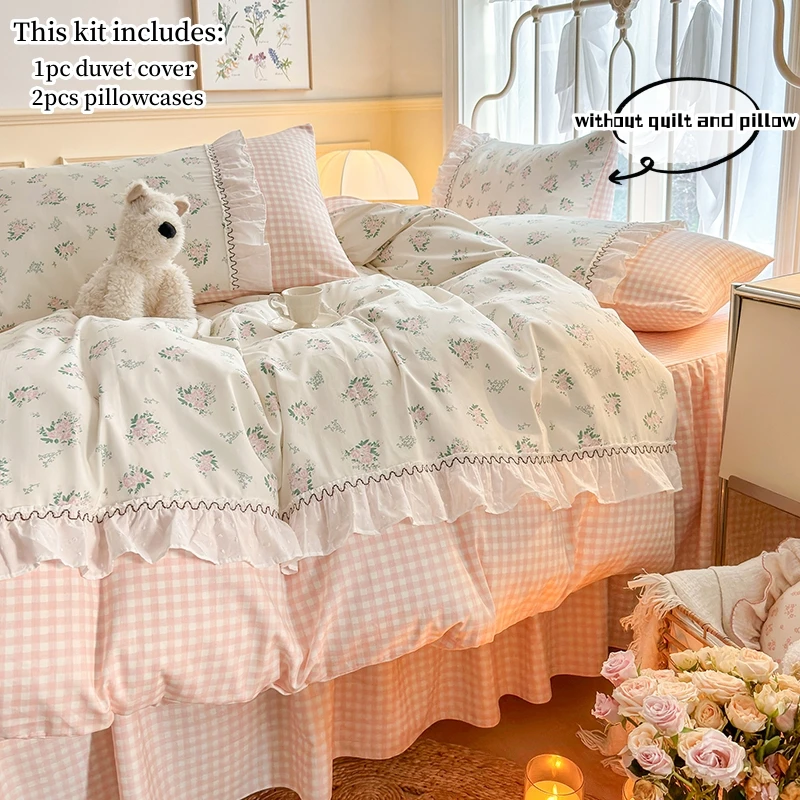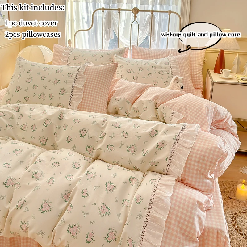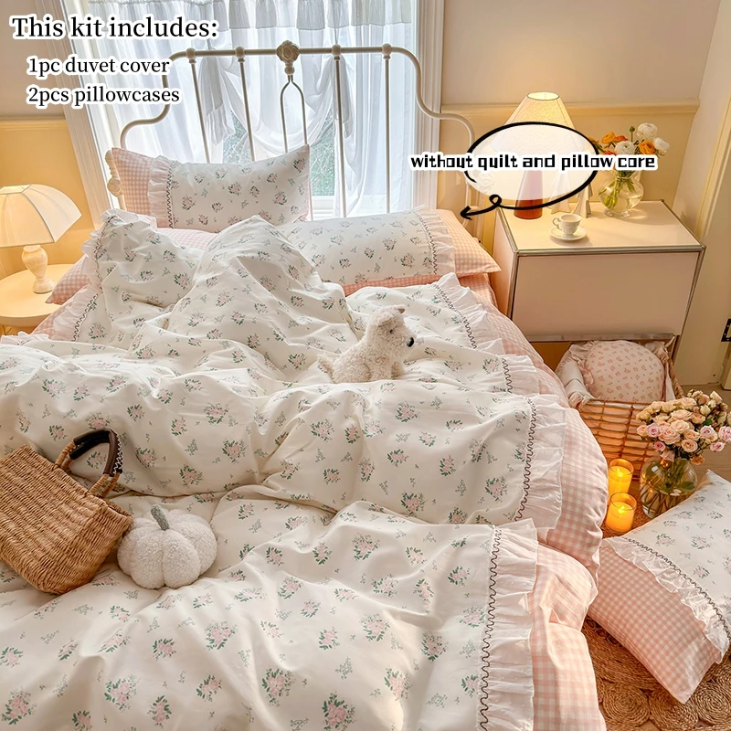 Conjunto de cama coreano para meninas, capa de edredão floral fronha de linho, lençol plano, gêmeo, solteiro, queen size, 3 peças