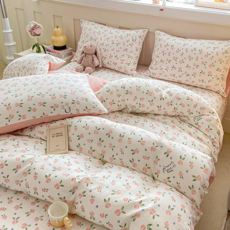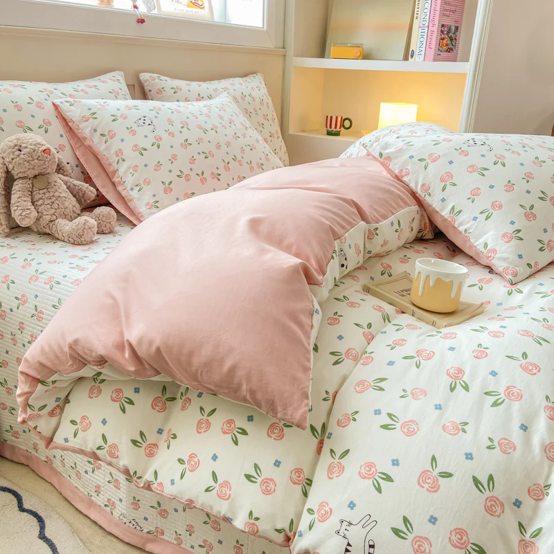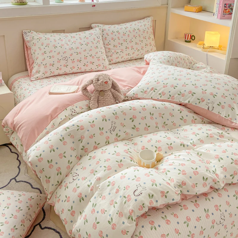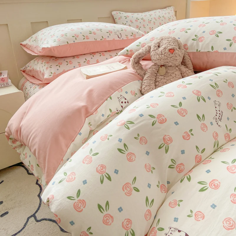 Conjunto de cama infantil com 3 peças, colcha rosa, capa de edredão floral vegetal, padrão de gato, desenhos animados fofos, conjunto de cama para meninas, decoração do quarto