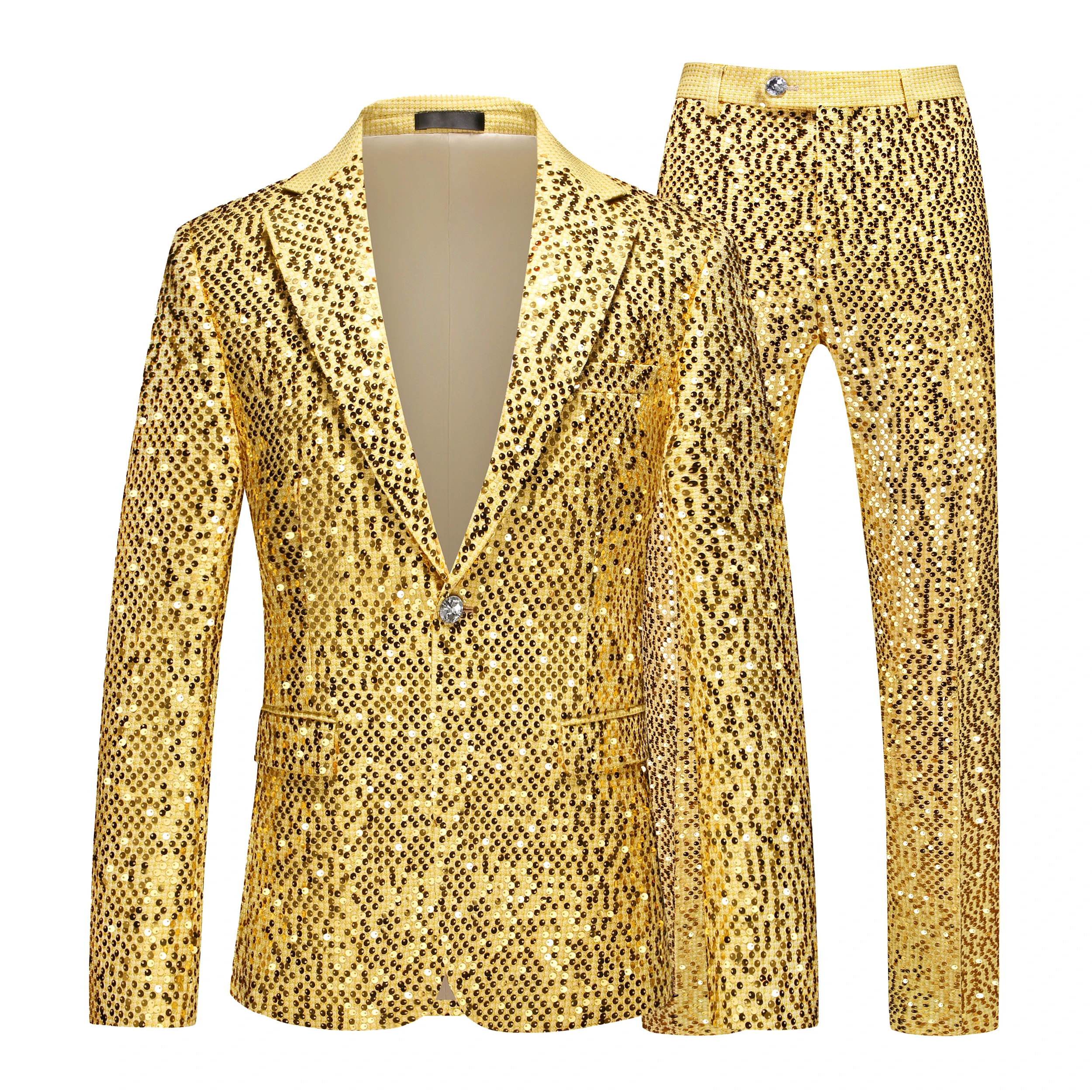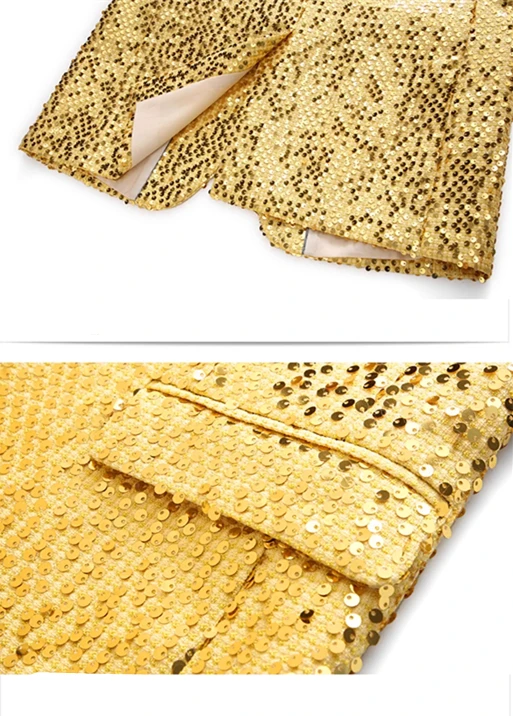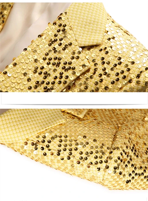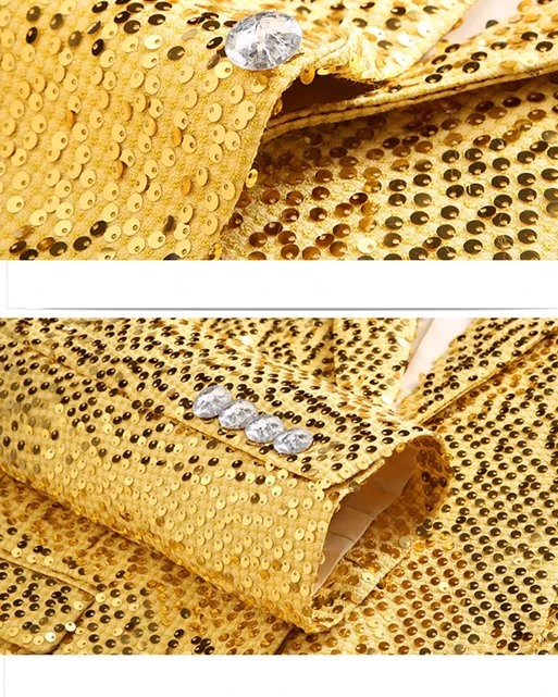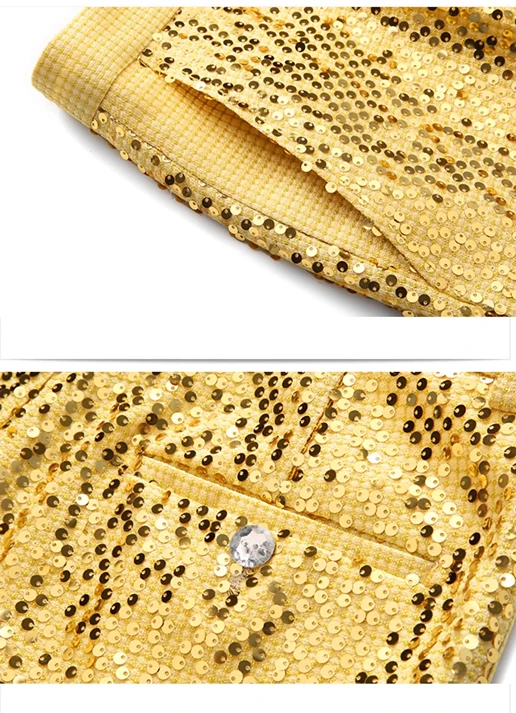 Conjunto de duas peças de terno de moda fino de lantejoulas douradas masculinas, performance de palco, fantasia de anfitrião. Top + Calça