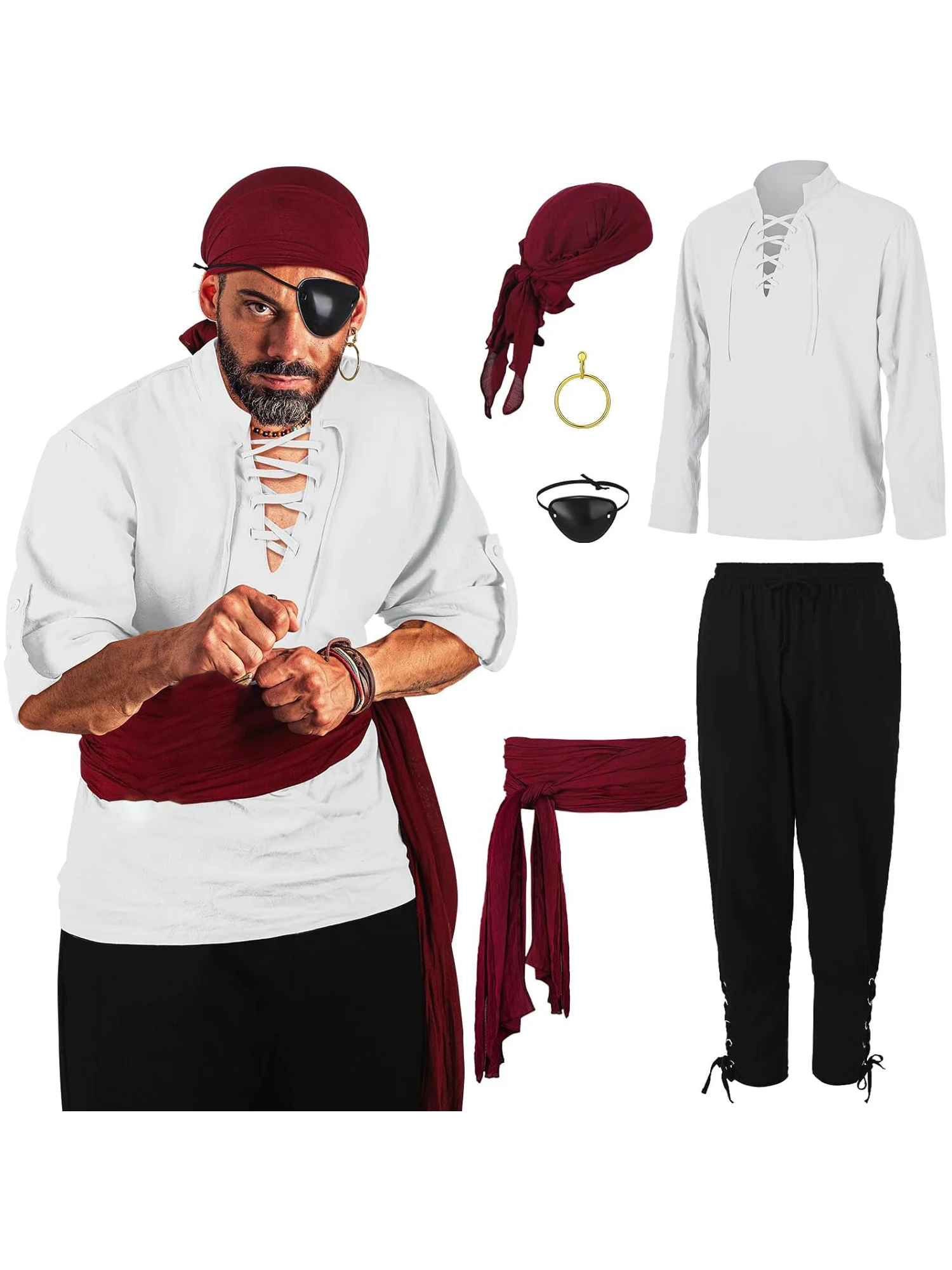 Conjunto de fantasia renascentista de halloween masculino, camisa pirata medieval, calças com faixas no tornozelo, cinto, óculos, acessórios de brinco