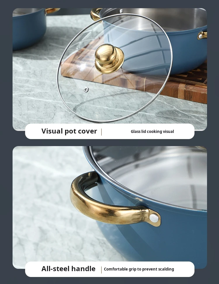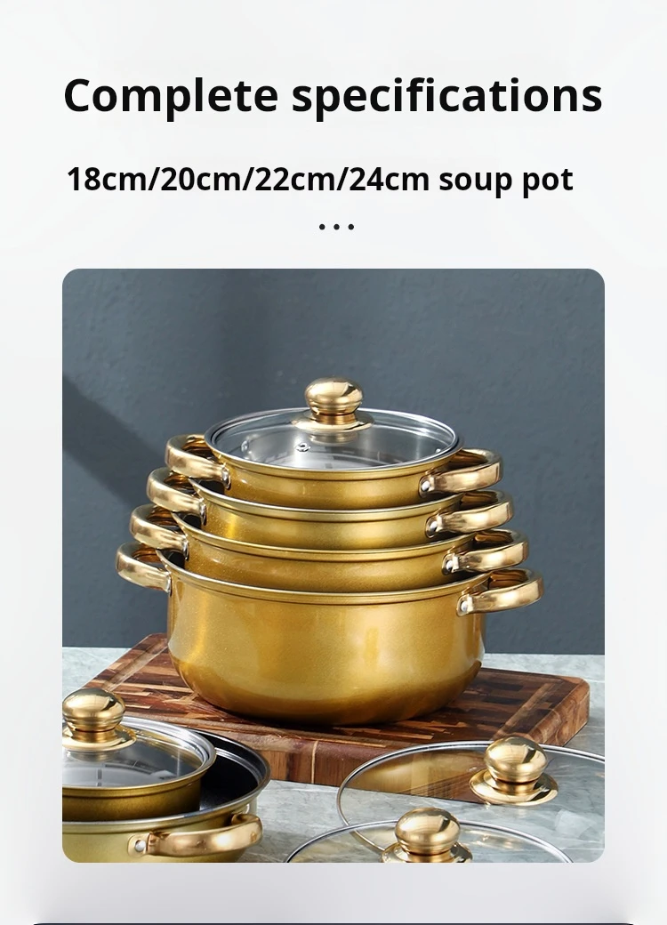 Conjunto de panelas de aço inoxidável de 12 peças, metal antiaderente, alça dourada, panelas e panela para uso na cozinha