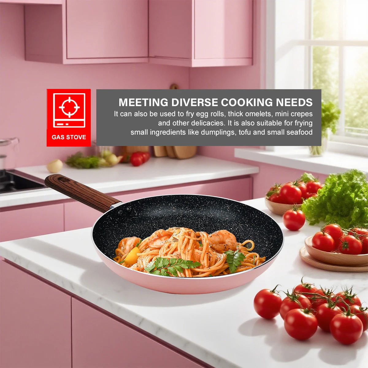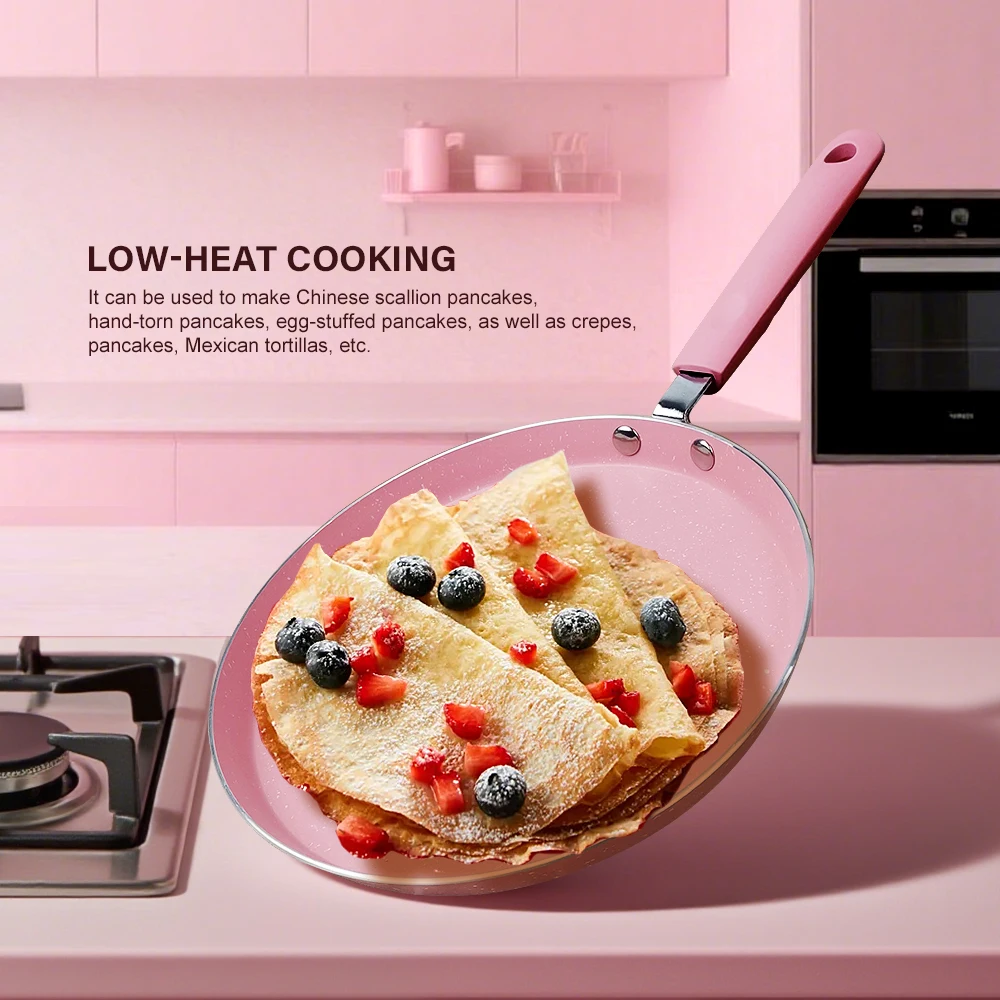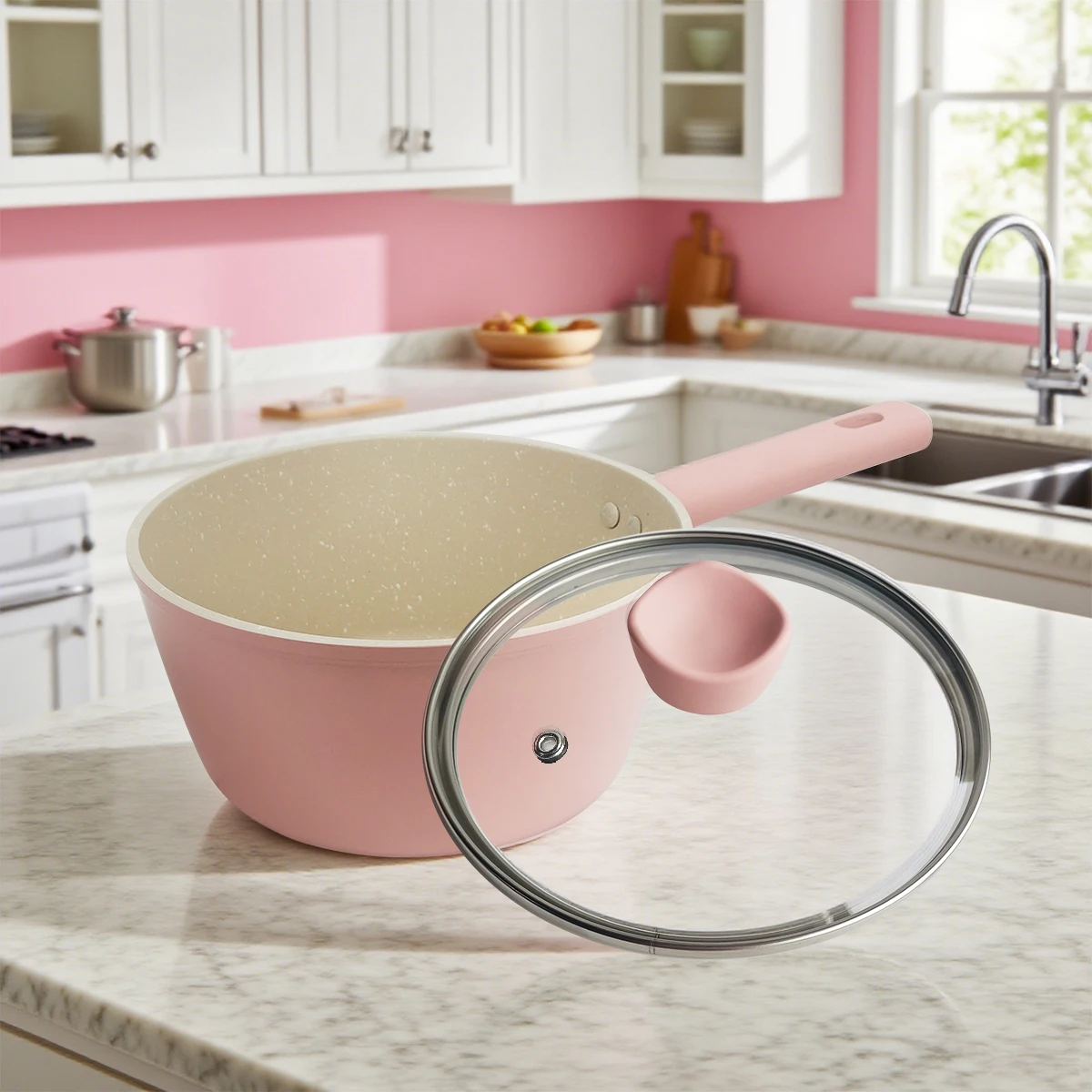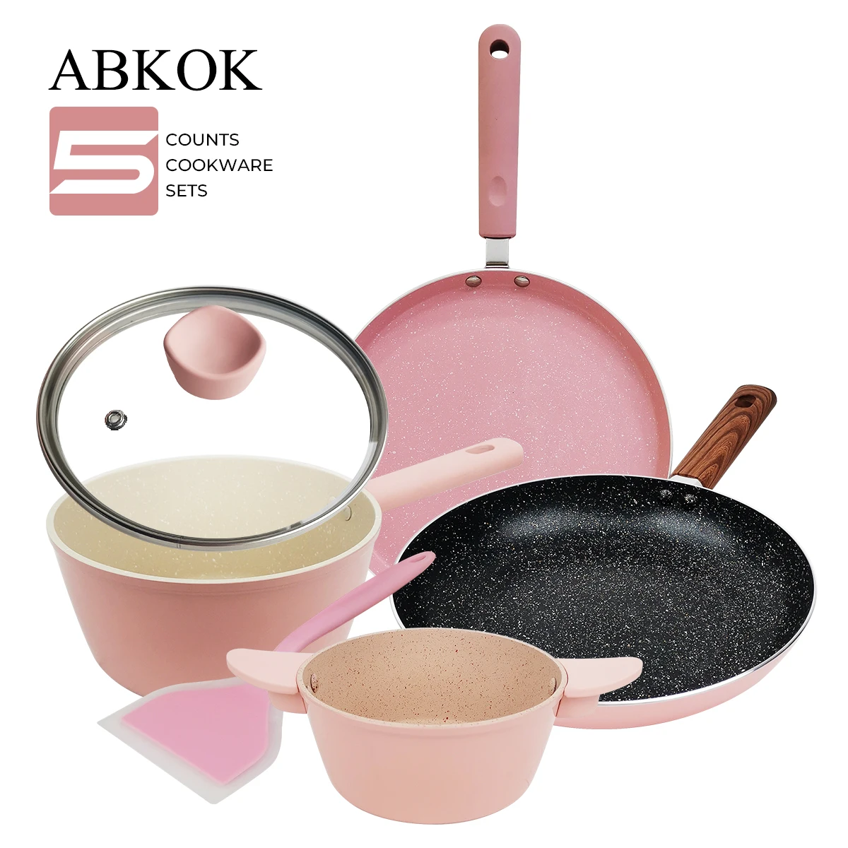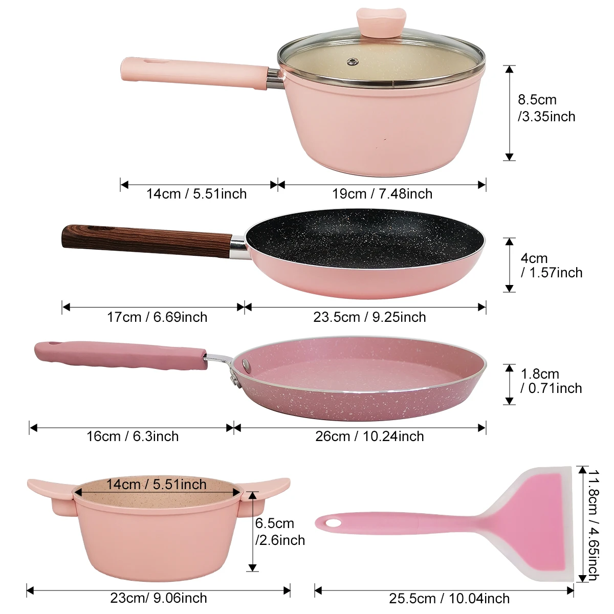 Conjunto de panelas e frigideiras de 5 com panela de 2,1QT com tampa, panela de panqueca de 10 polegadas, panela de ovo de 9,2 polegadas, compatível com todas as tampas de fogão, rosa