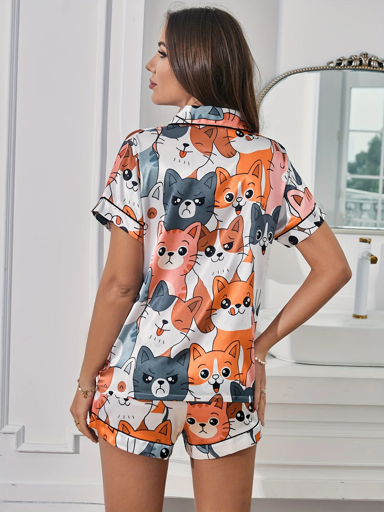 - > Conjunto de pijama cetim de gato e cachorrinho feminino, pijamas de manga curta, lapela, shorts elásticos, botões fofos