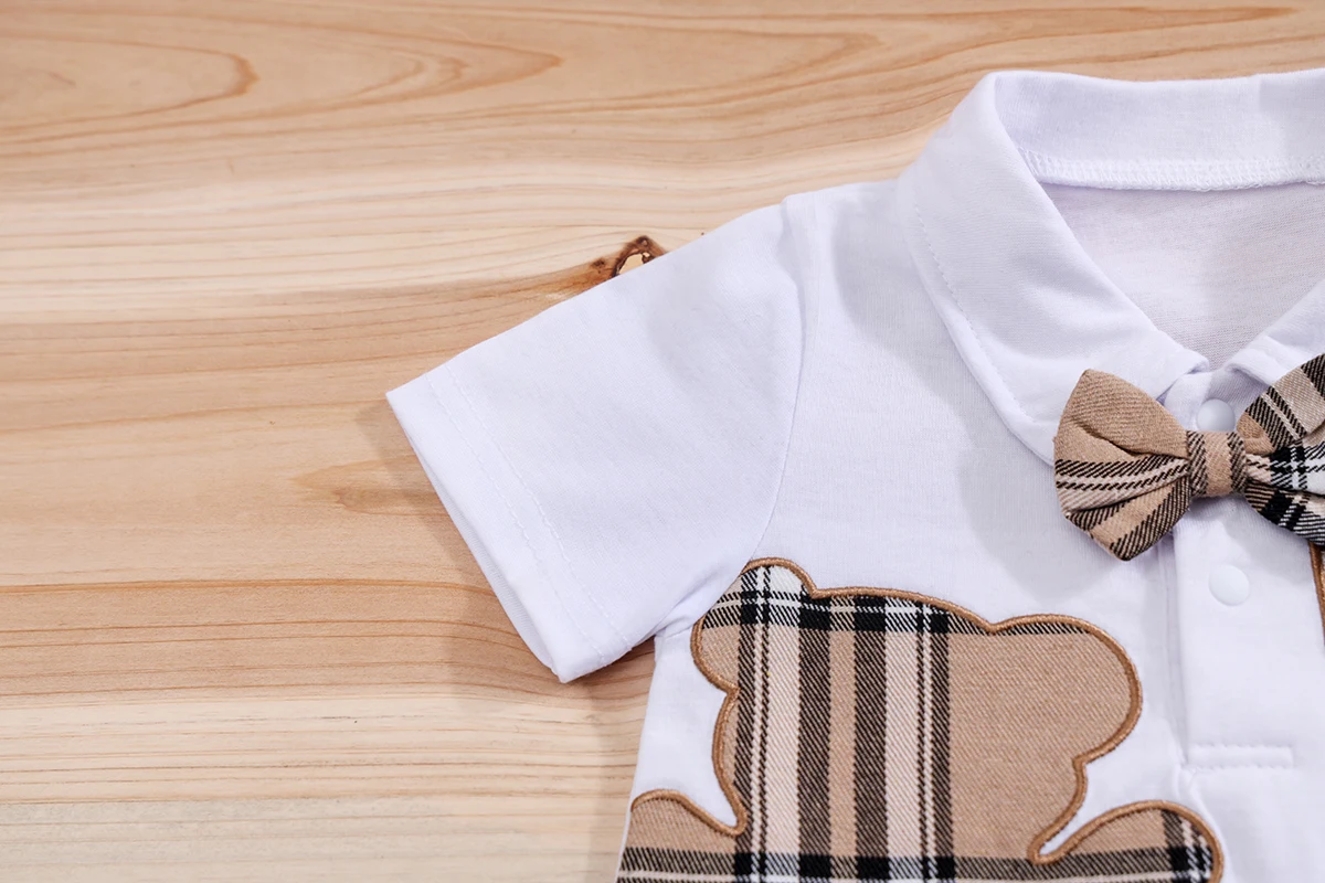 Conjunto de roupas de bebê murnxb, 2 peças, manga curta, meninos, infantil, xadrez, urso, body + suspensórios, calças, conjunto geral, roupas para recém-nascidos de 1 a 18 meses