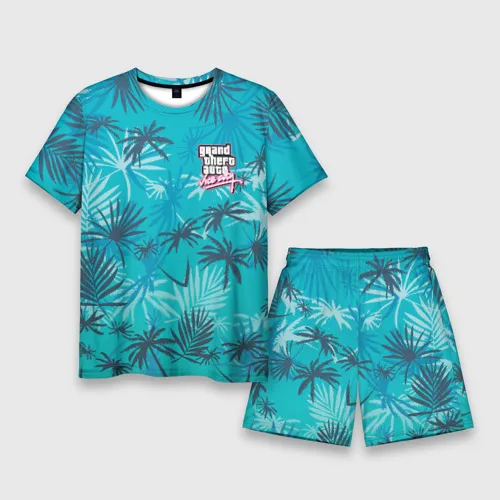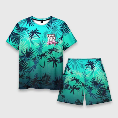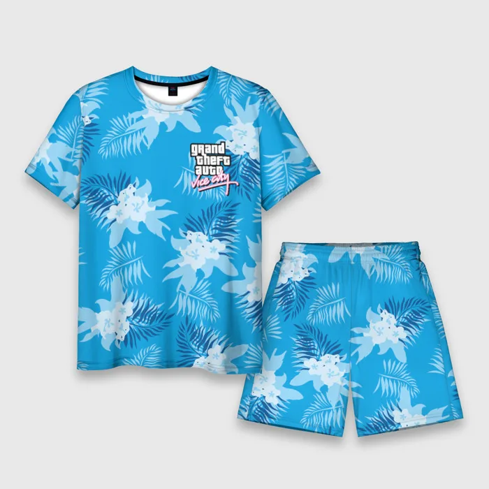 Conjunto de shorts de praia de verão masculino, roupas de homem extragrande, Game Grand Theft Auto 3D Palm Tree Print, GTA T-shirt, 2 Pcs Set