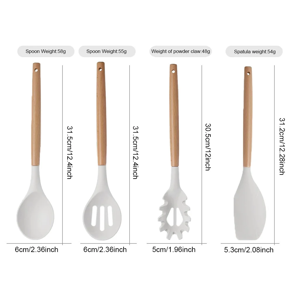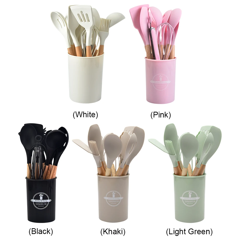Conjunto De Utensílios De Cozinha De Silicone Antiaderente, Utensílios De Cozinha, Espátula, Pá, Batedores De Ovo, Cabo De Madeira, Ferramenta De Cozinha, Panelas, 12Pcs
