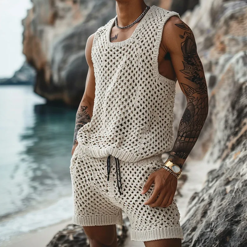 Verão Novos Homens Casual Malha de Duas Peças Define Moda Sólida Tanque Solto Tops e Shorts Terno Do Esporte Da Praia Homens Oco Out Streetwear