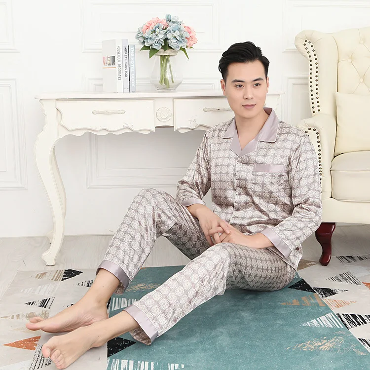 - > Conjuntos de pijama masculino de cetim de seda manga comprida, pijamas masculinos, camisola estampada, Casa, Soft Cozy Sleepwear Calças, Novo