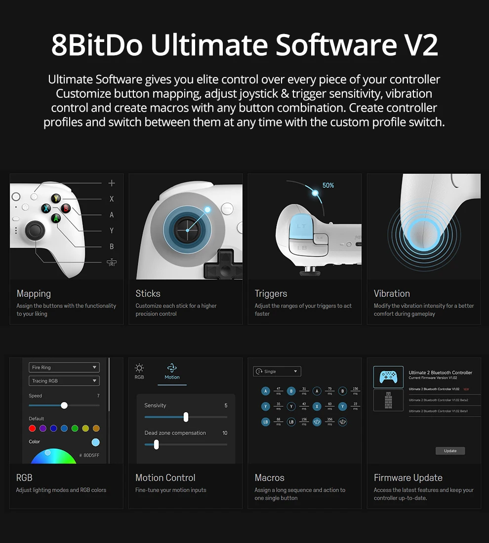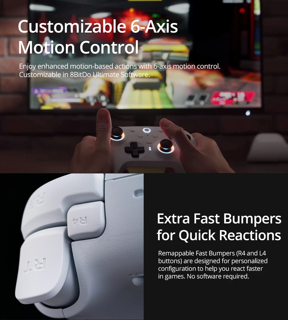 Controlador de jogos sem fio 8BitDo Ultimate 2 para PC e Android com joysticks TMR, gatilhos comutáveis, controle de movimento, 8 velocidades