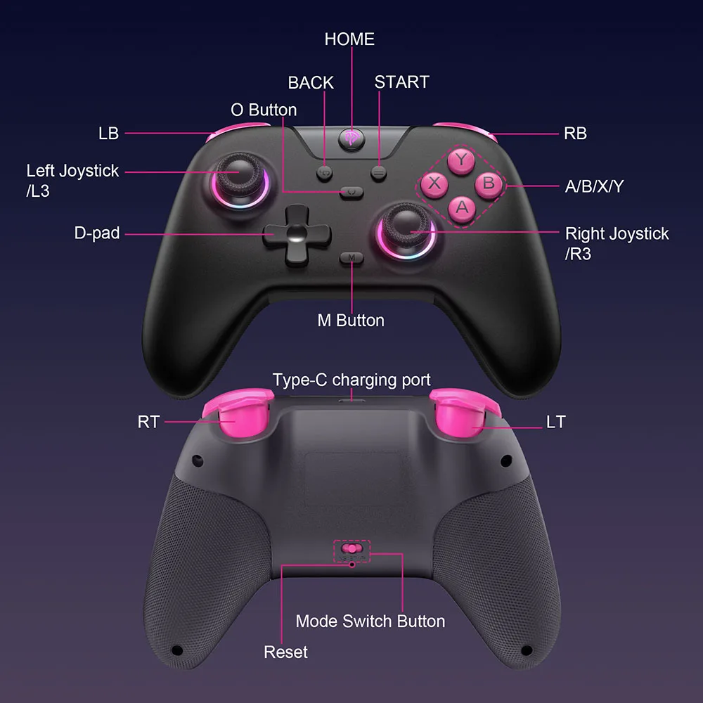 Calibração de joystick e gatilho: O controlador permite a calibração pressionando HOME+BACK+B por 3 segundos, permitindo ajustes precisos para gatilhos e joysticks para uma experiência de jogo ideal