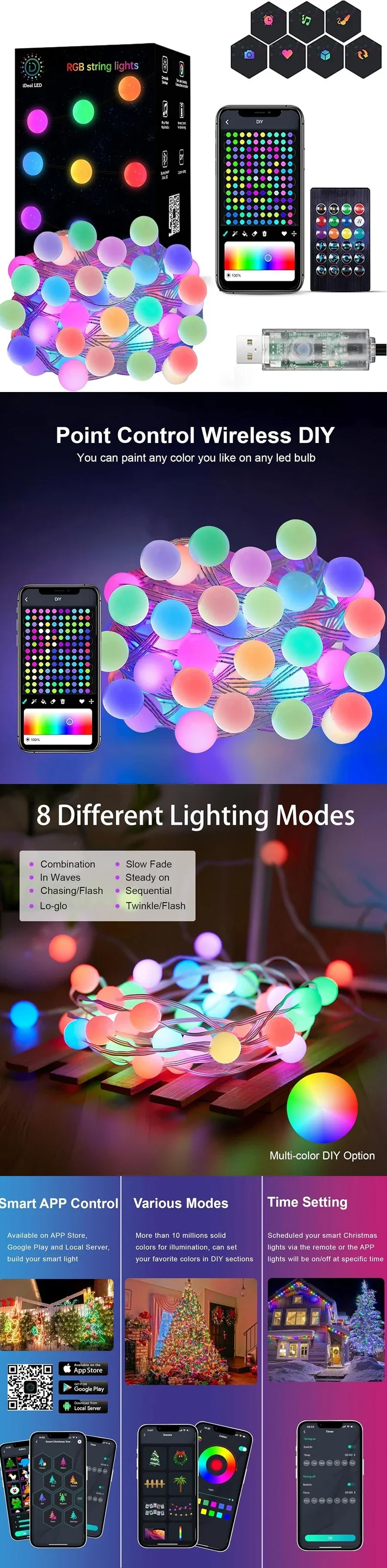 Cordas de iluminação led fada à prova dwaterproof água bolha bola lâmpada bluetooth app controle remoto usb controlador música sonho cor natal